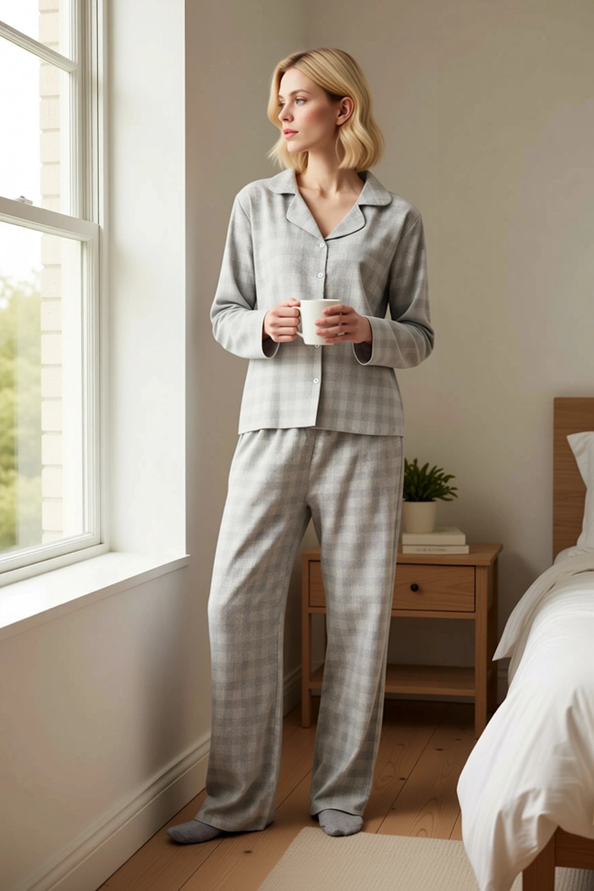 Kadın Ekose Kareli Gömlek Yaka Uzun Kol Regular Kalıp Dokuma Pijama Takımı Fonksiyonel Şık