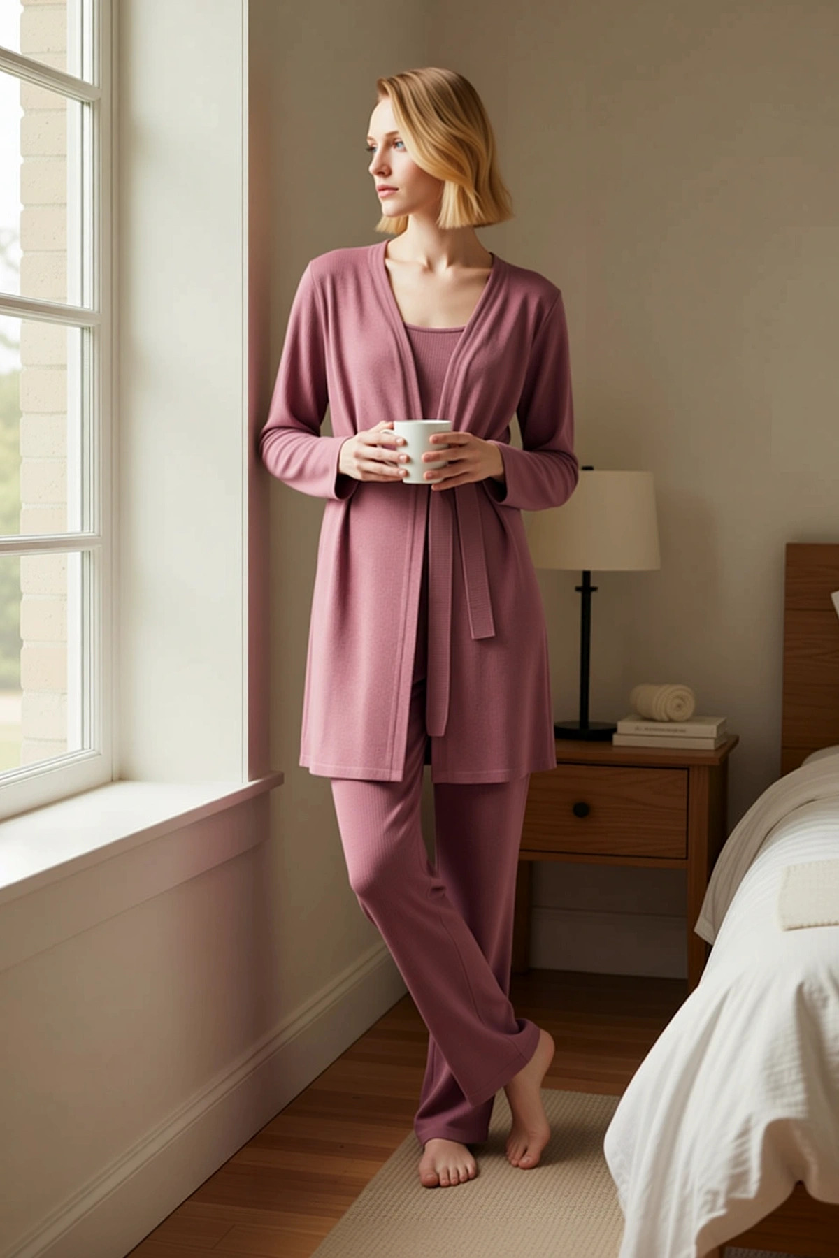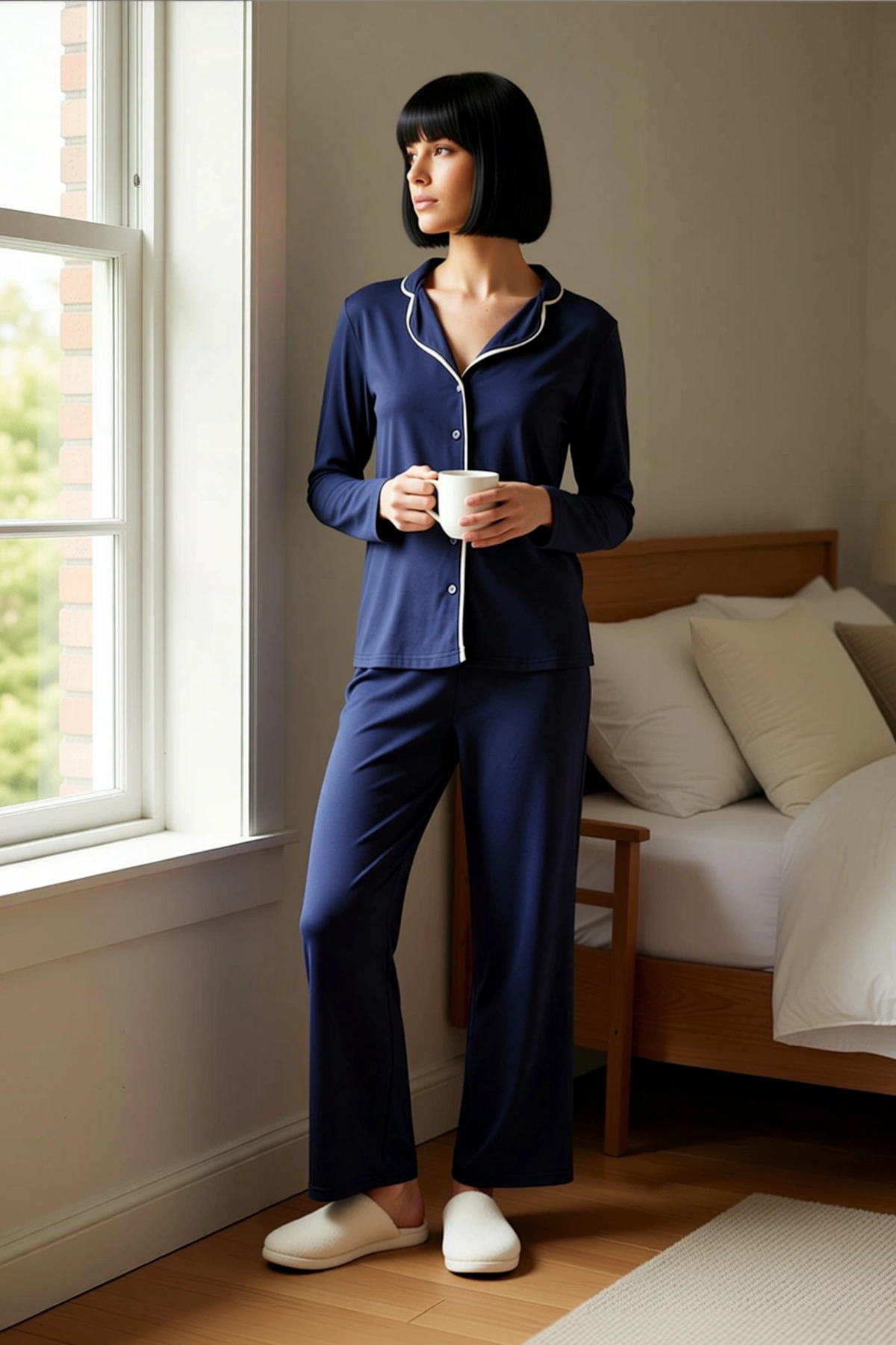 Kadın Gömlek Yaka Standart Kol Regular Kalıp Fitilli Örme Pijama Takımı Fonksiyonel Modern