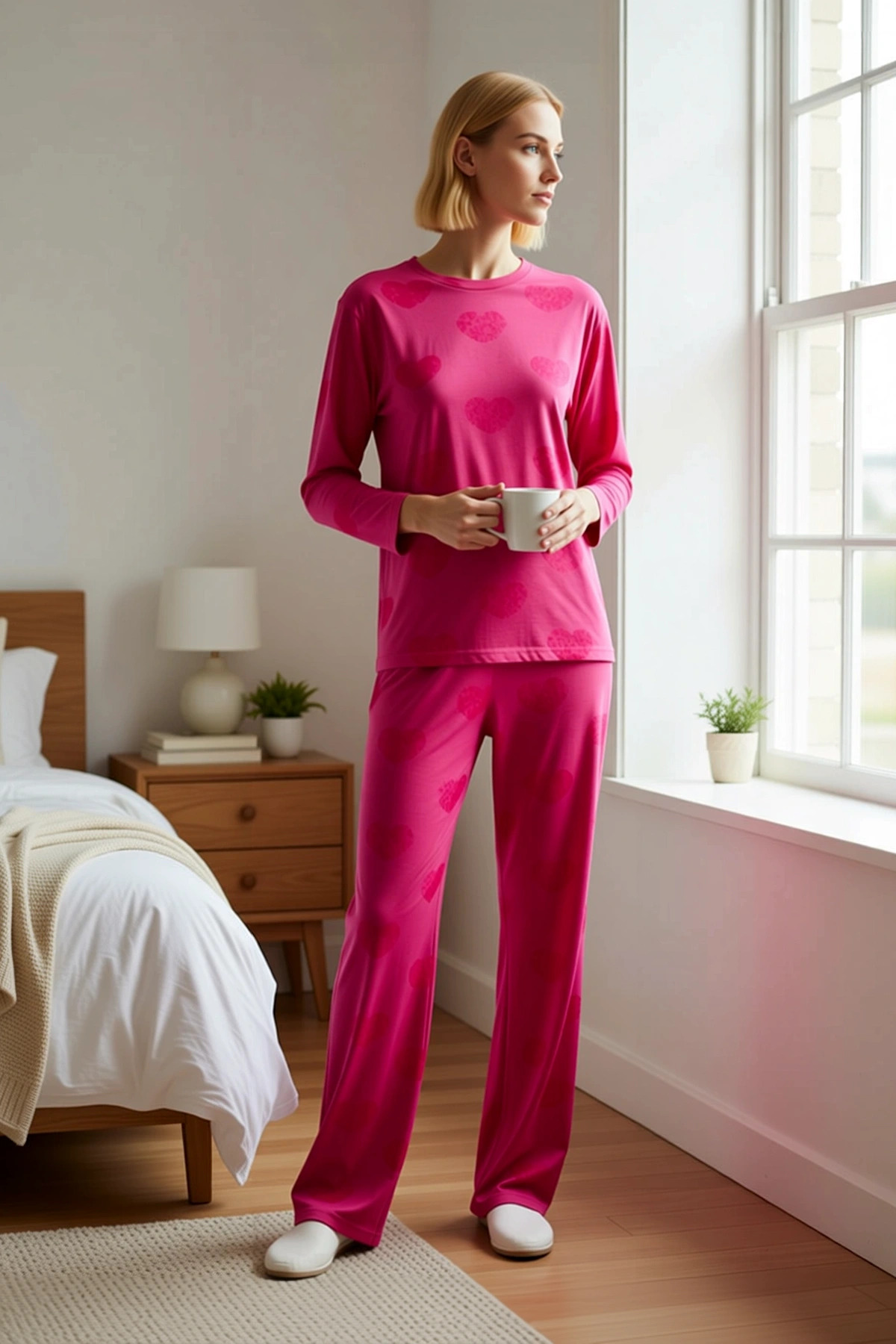Kadın Müslin Dokuma Gömlek Yaka Kısa Kol Kalp Desenli Pijama Takımı Fonksiyonel 0 Pamuk