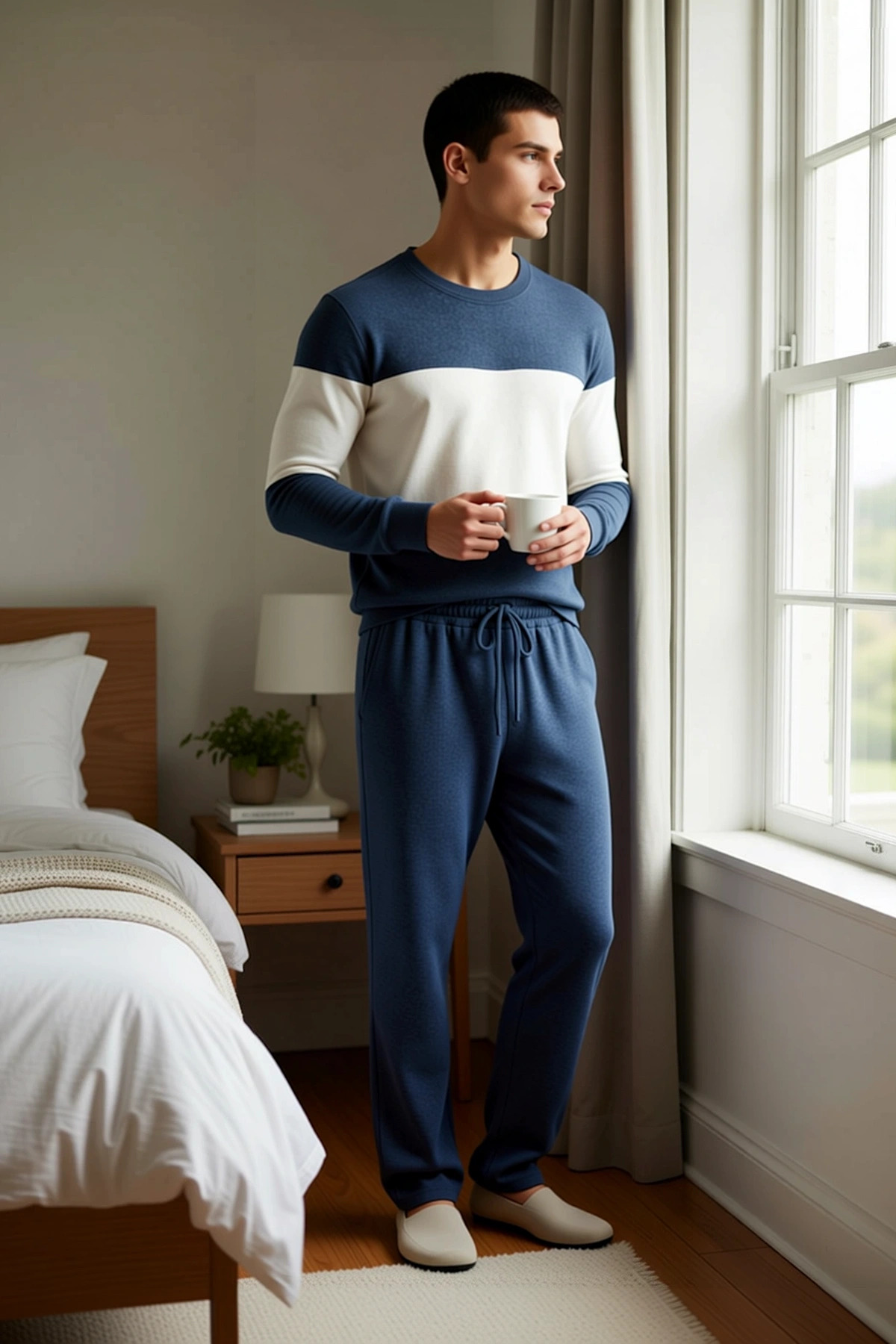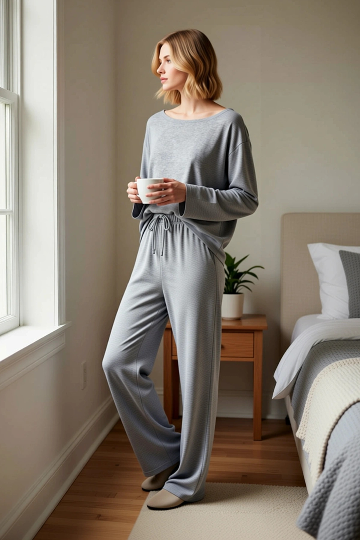 Kadın Bisiklet Yaka Düşük Kol Uzun Kollu Regular Kalıp Dokulu Örme Pijama Takımı Dayanıklı