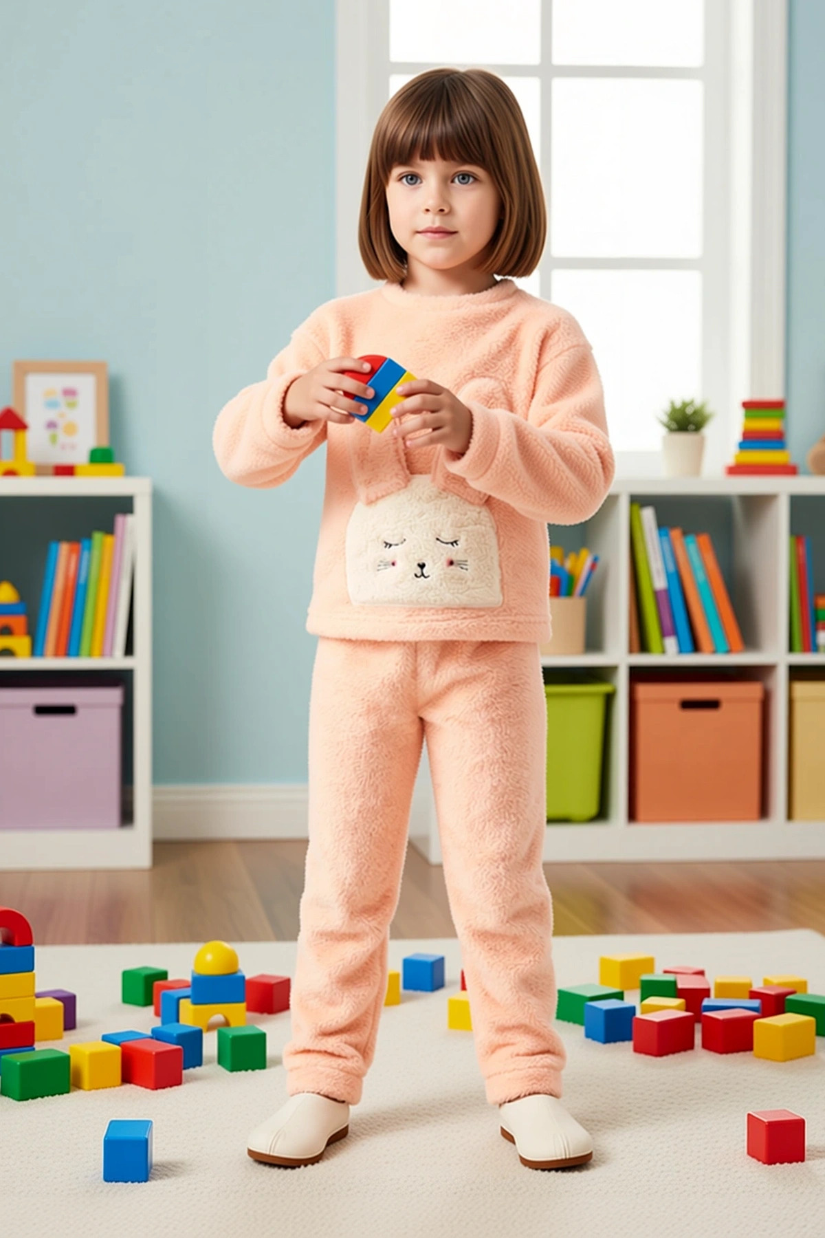 Kız Çocuk Bisiklet Yaka Standart Kol Uzun Kol Regular Kalıp Peluş Örme Pijama Takımı Dayanıklı