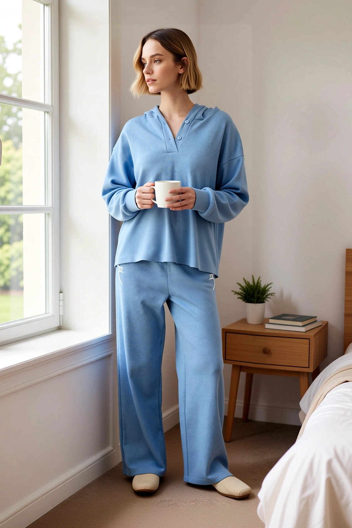 Kadın Kapüşonlu Standart Kol Regular Kalıp Waffle Örme Pijama Takımı Fonksiyonel Dayanıklı