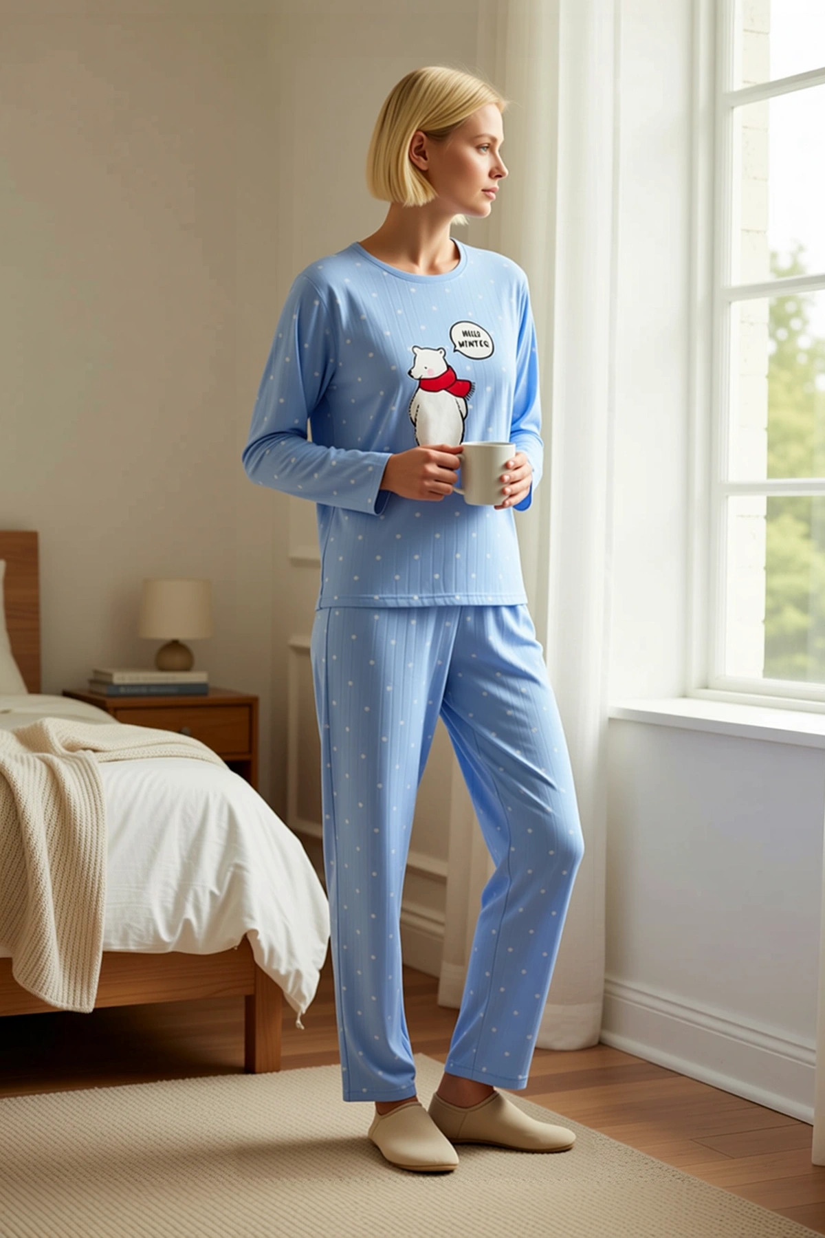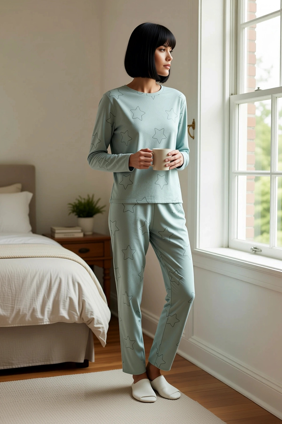 Kadın Bisiklet Yaka Uzun Kol Regular Kalıp Yıldız Desenli Örme Pijama Takımı Şık 0 Pamuk