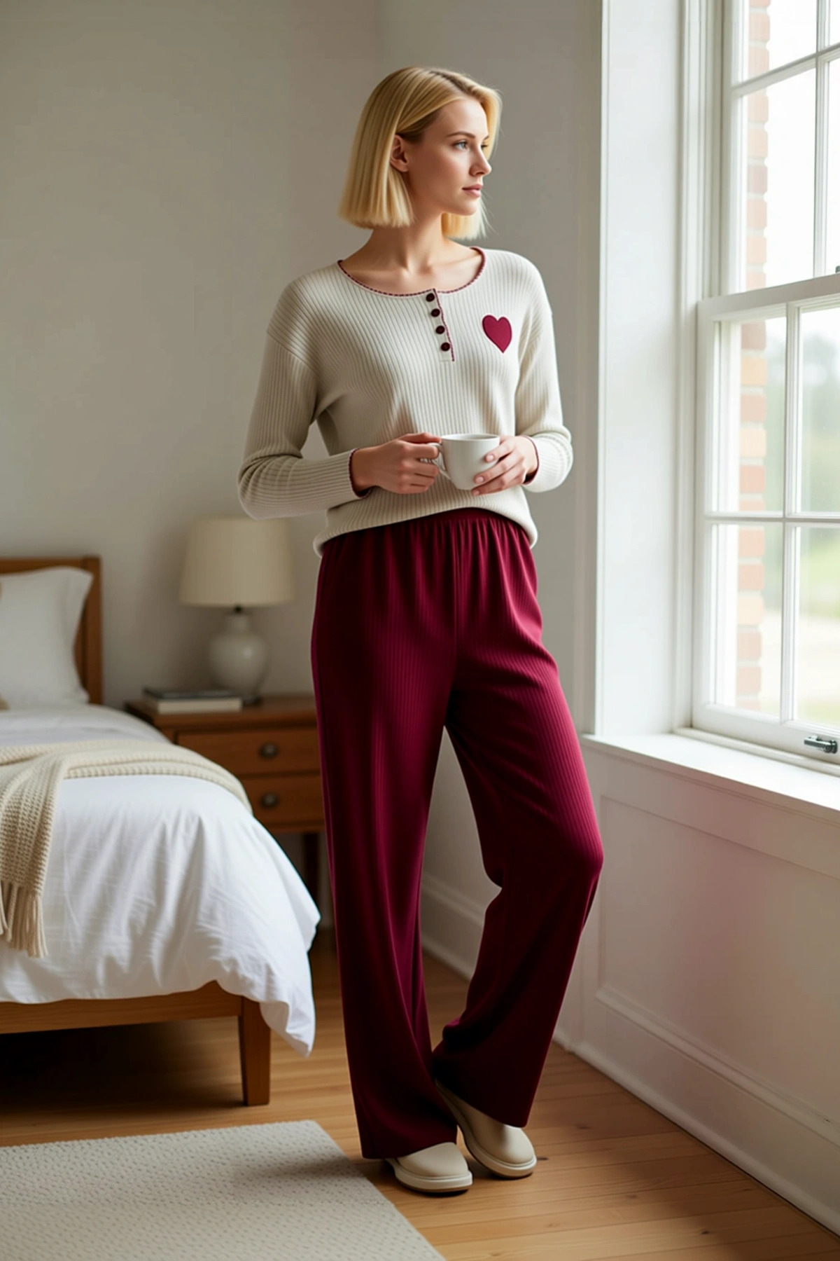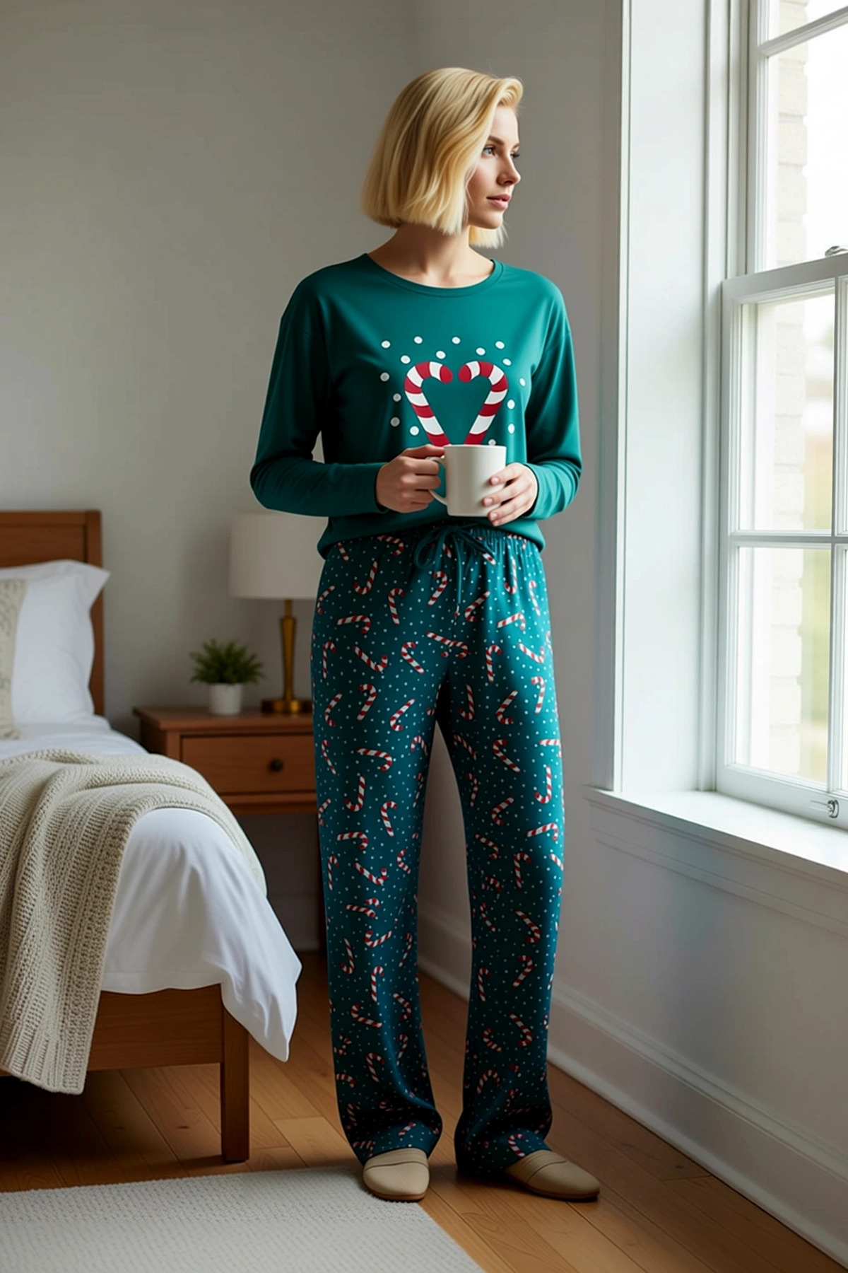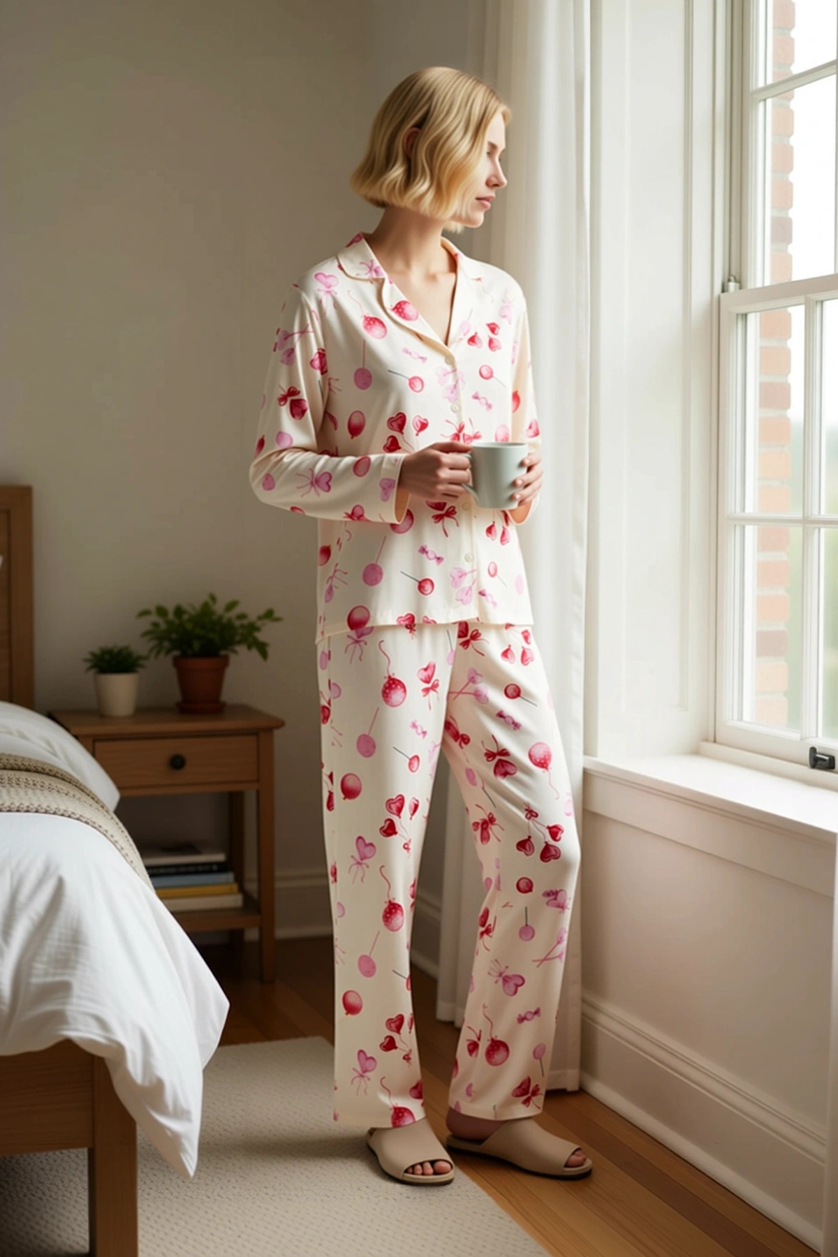 Kadın Gömlek Yaka Standart Kol Fitted Kalp Desenli Pijama Takımı Fonksiyonel Şık 0 Pamuk