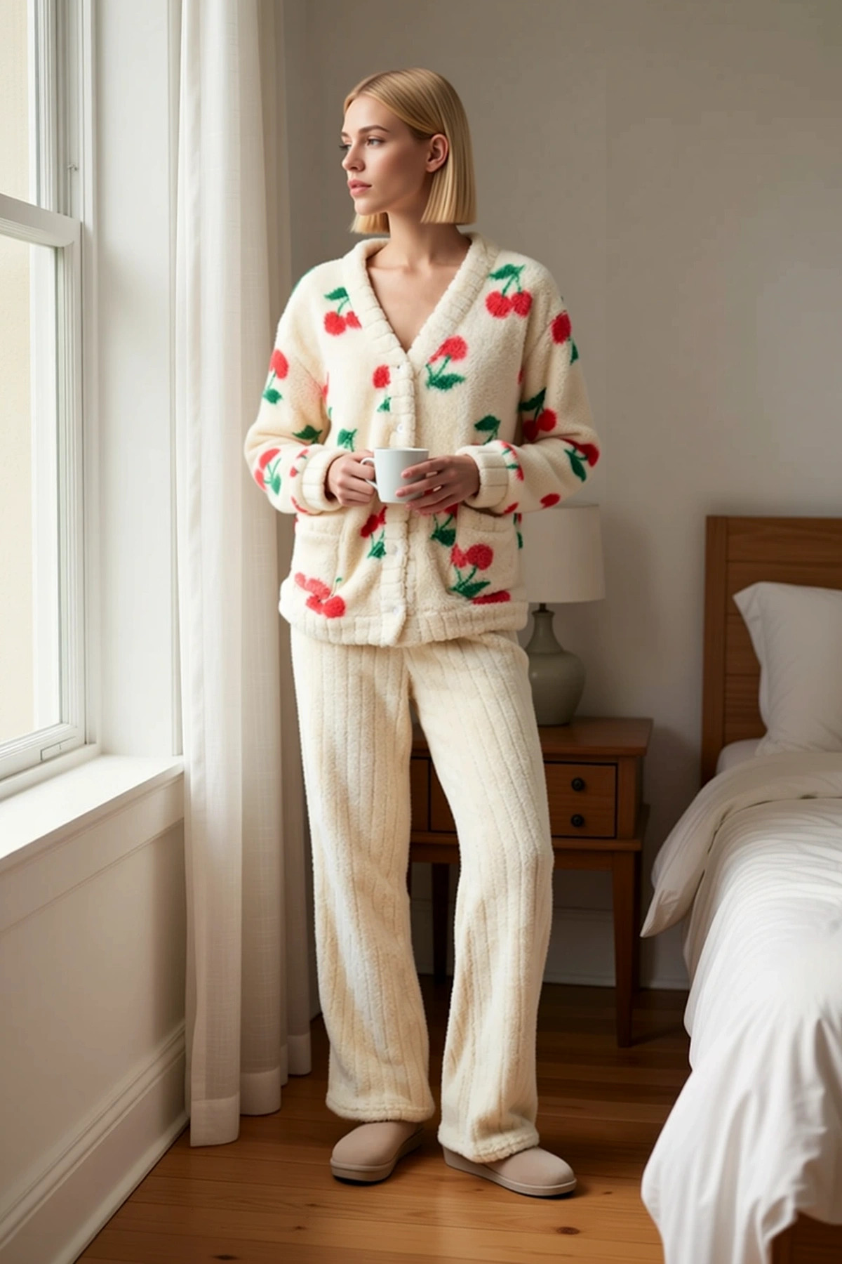 Kadın Bisiklet Yaka Standart Kol Regular Kalıp Polar Örme Puantiye Desenli Pijama Takımı Şık