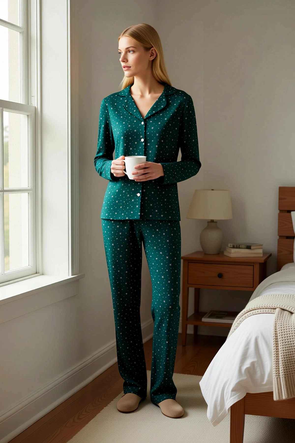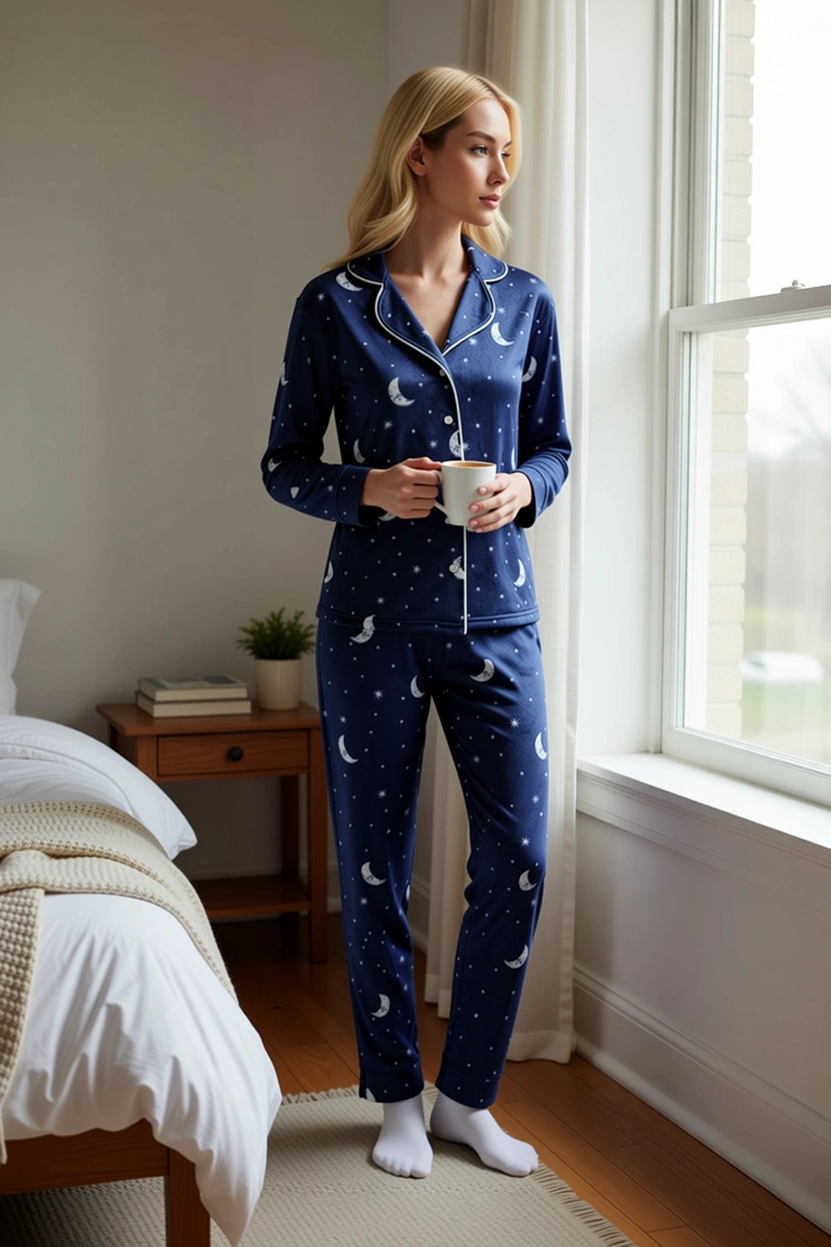 Kadın Gömlek Yaka Standart Kol Regular Kalıp Galaksi Desenli Pijama Takımı Spor 0 Pamuk