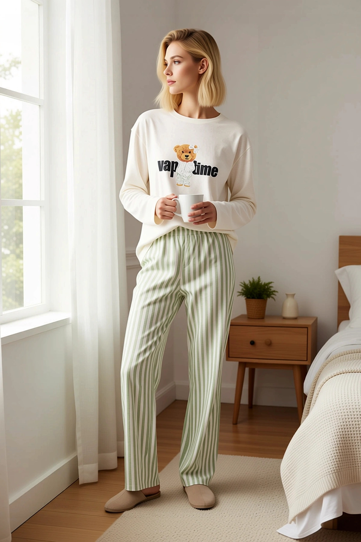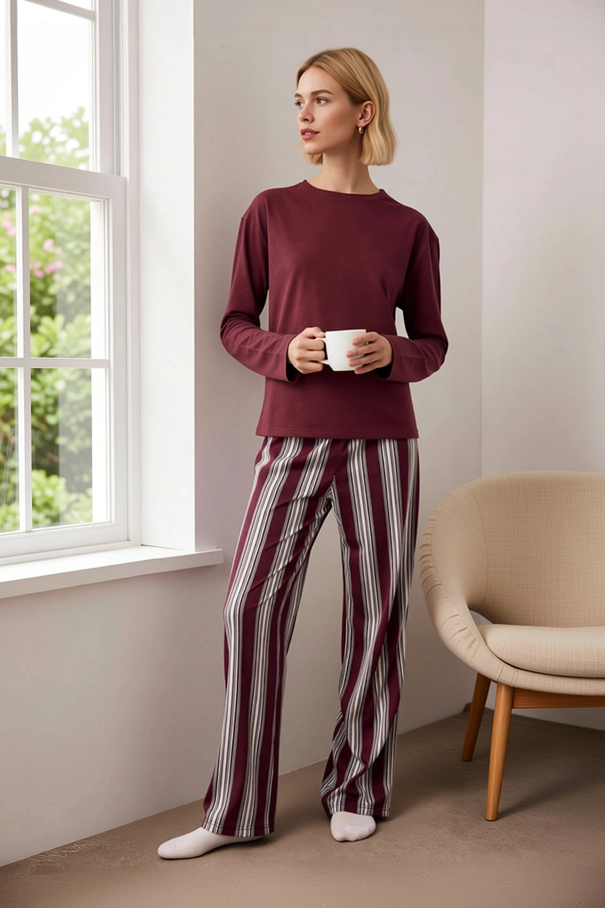 Kadın Bisiklet Yaka Uzun Kol Regular Kalıp Çizgili Pijama Takımı Fonksiyonel Şık 0 Pamuk