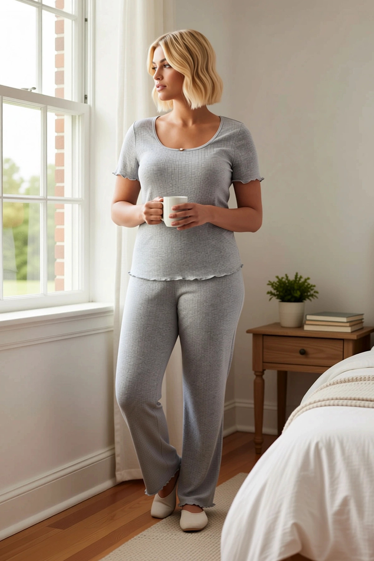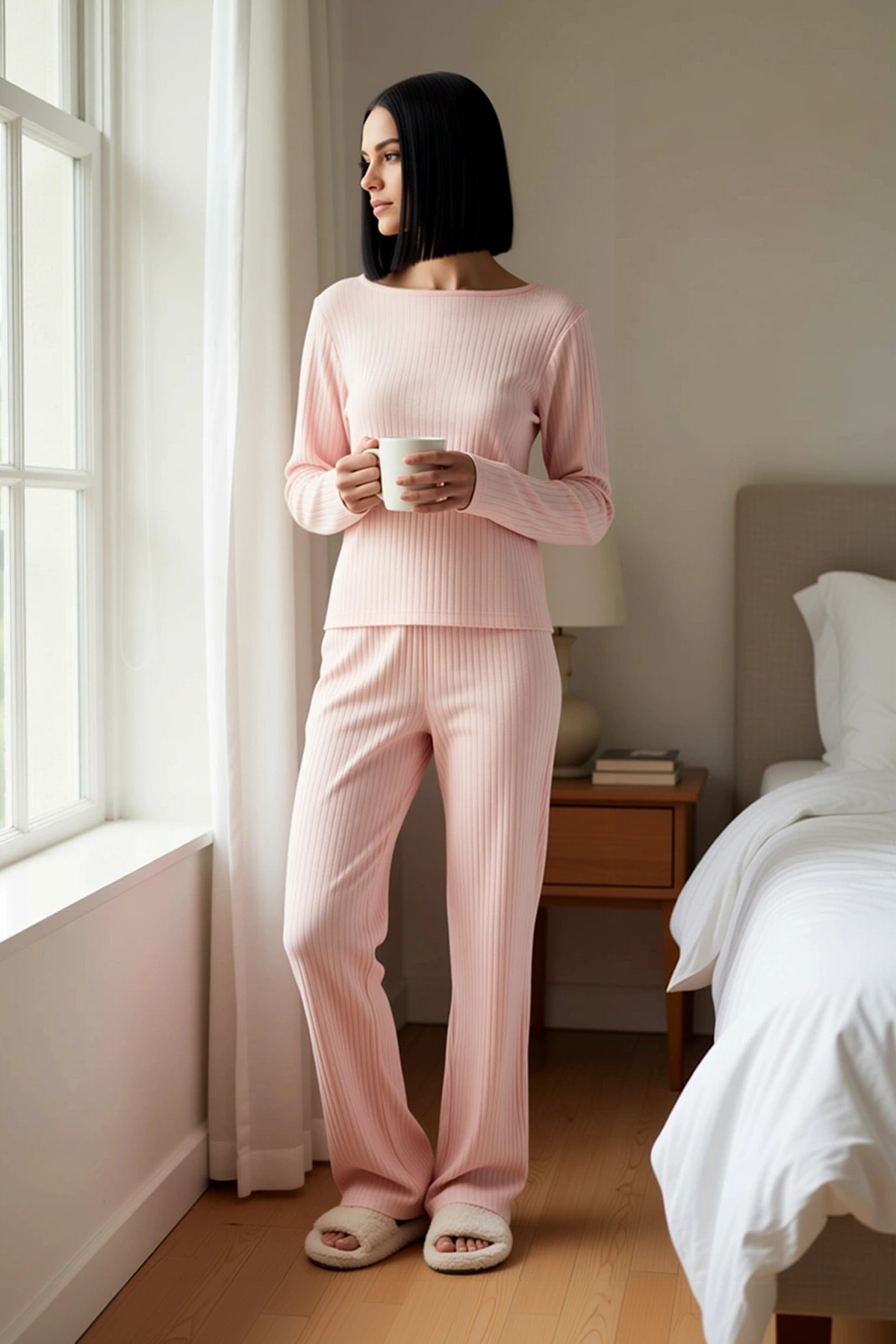 Kadın Gömlek Yaka Uzun Kol Regular Kalıp Dokulu Örme Pijama Takımı Fonksiyonel Dayanıklı Şık
