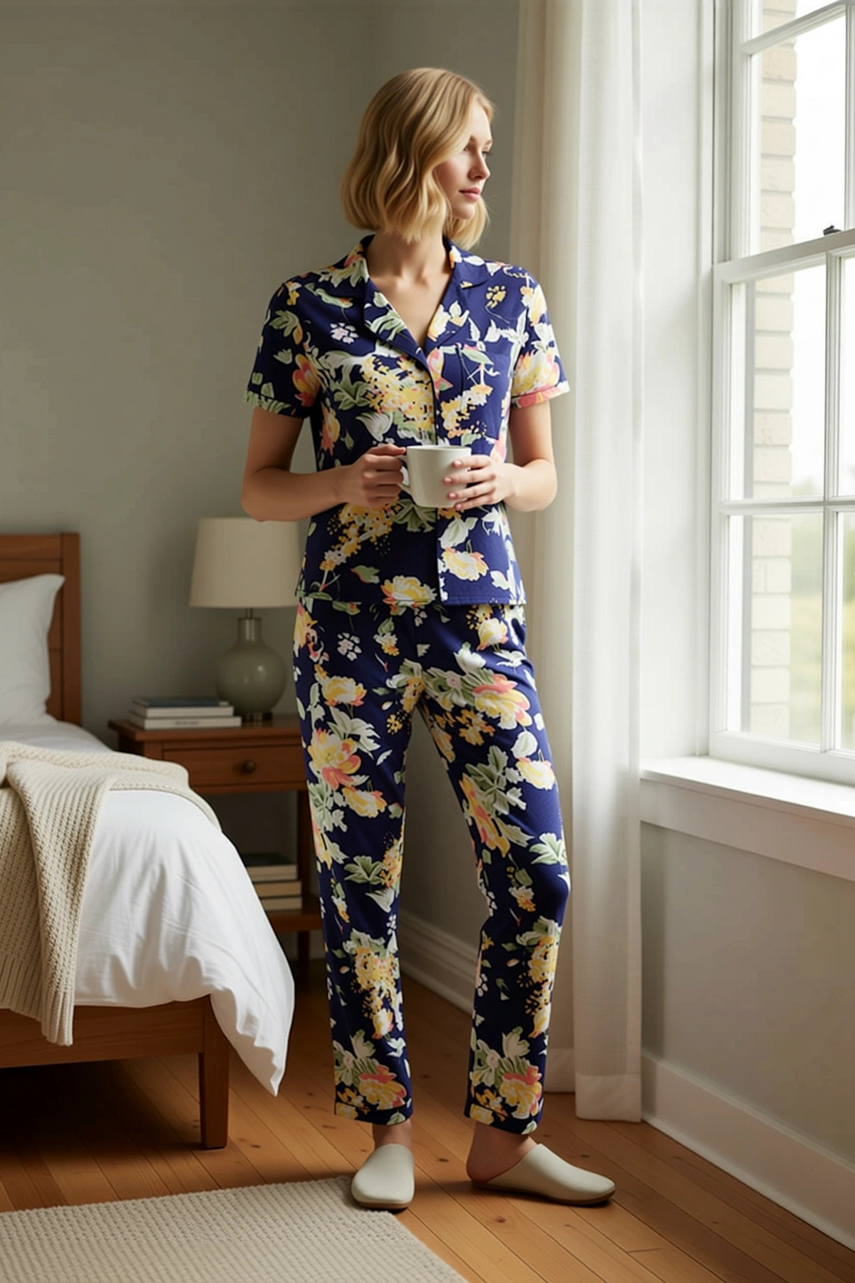 Kadın Gömlek Yaka Kısa Kol Eğlence Desenli Pijama Takımı Regular Kalıp Kaliteli 0 Pamuk
