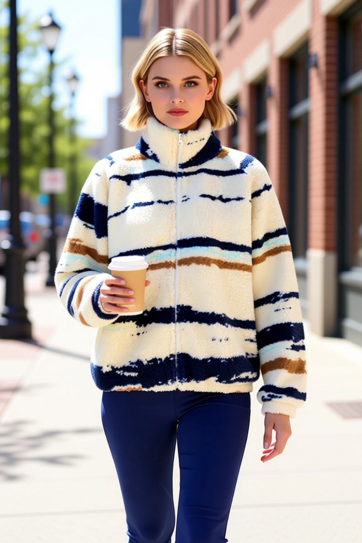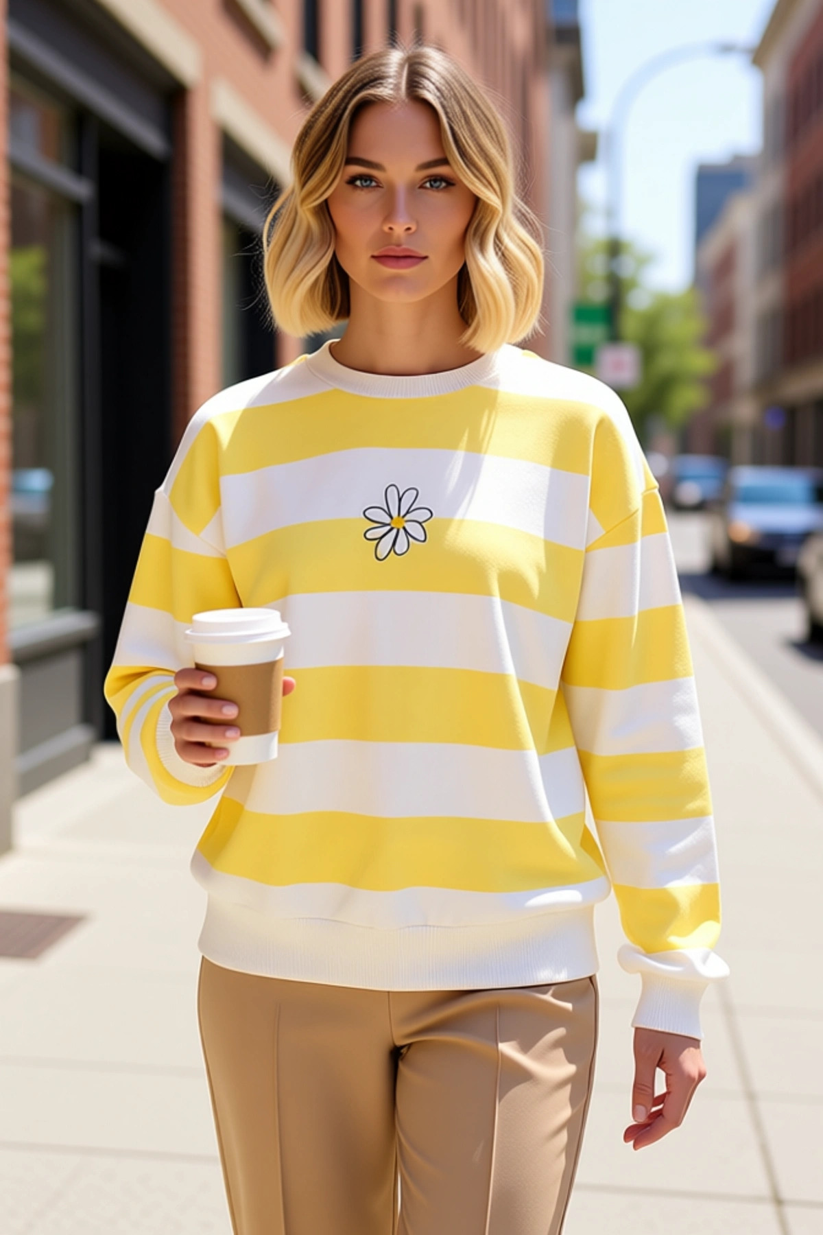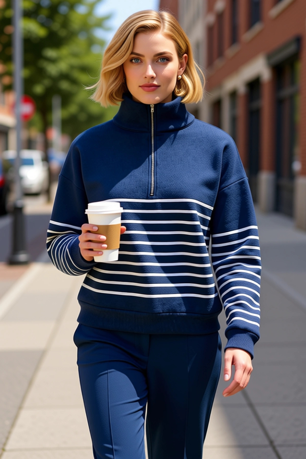 Kadın Dik Yaka Düşük Kol Fermuarlı Çizgili Oversize Kalın Örme Sweatshirt Fonksiyonel Spor