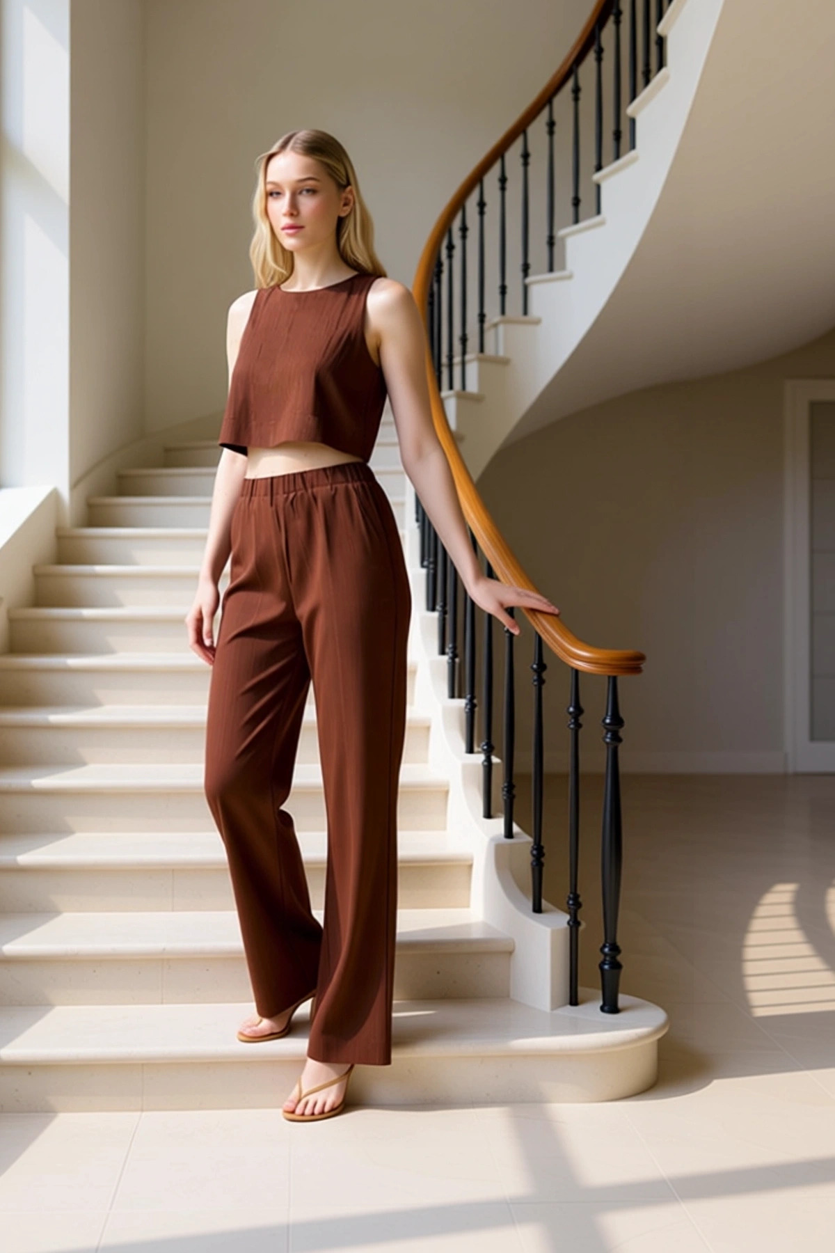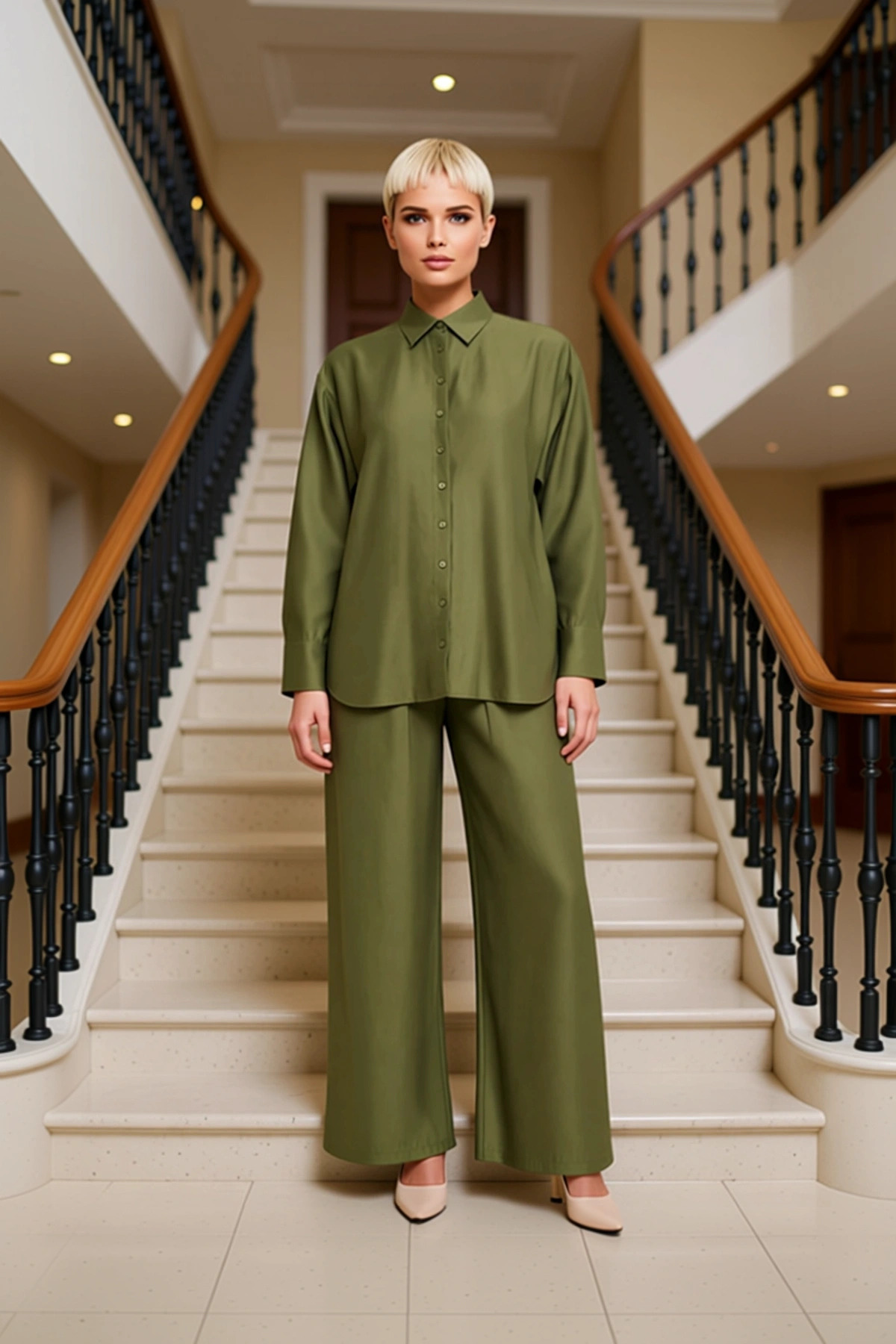 Kadın Alt Üst Dokuma Kumaş Düz Desen Gömlek Geniş Paça Pantolon İkili Takım Zarafet Konfor