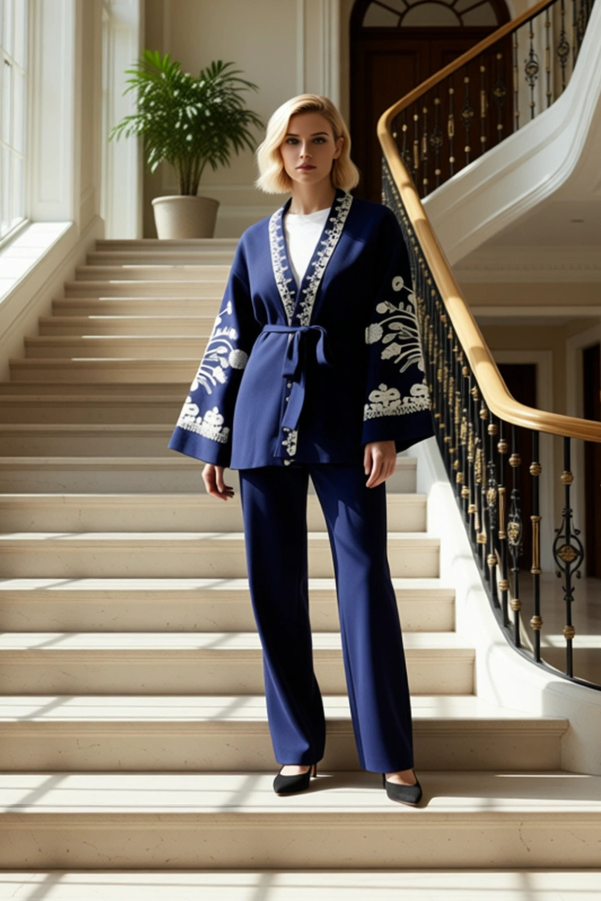 Kadın Alt Üst Nakış Detaylı Kruvaze Triko Hırka Ve Geniş Paça Pantolon Takımı Konforlu Şıklık Spor