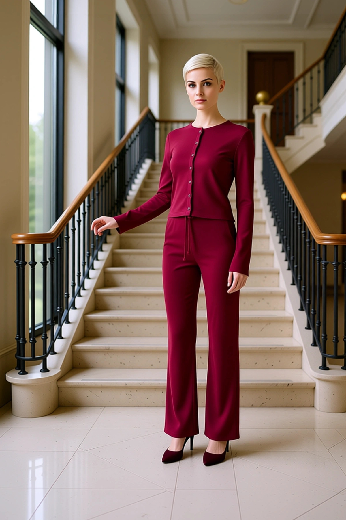 Kadın Alt Üst Fitted Kesim Düğmeli Uzun Kollu Örme Üst Ve Rahat Geniş Paça Pantolon Takımı Konfor