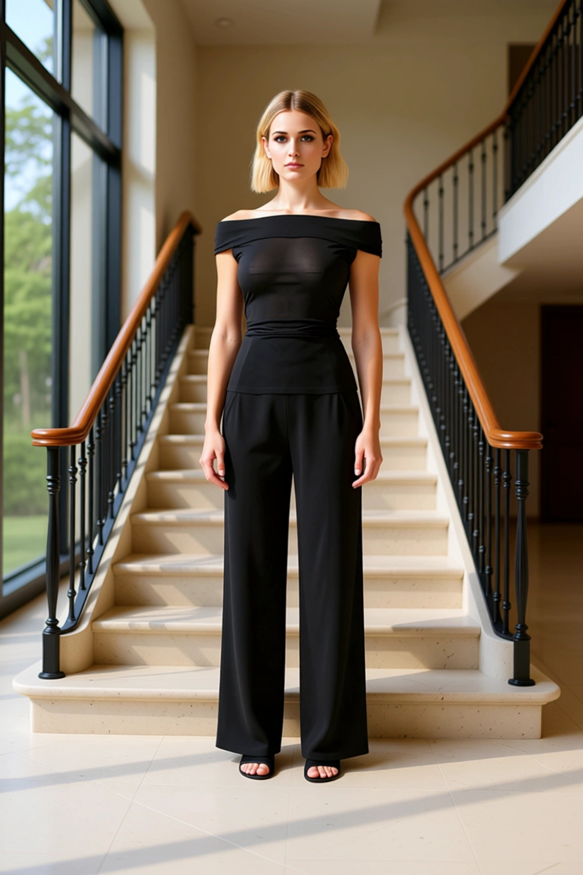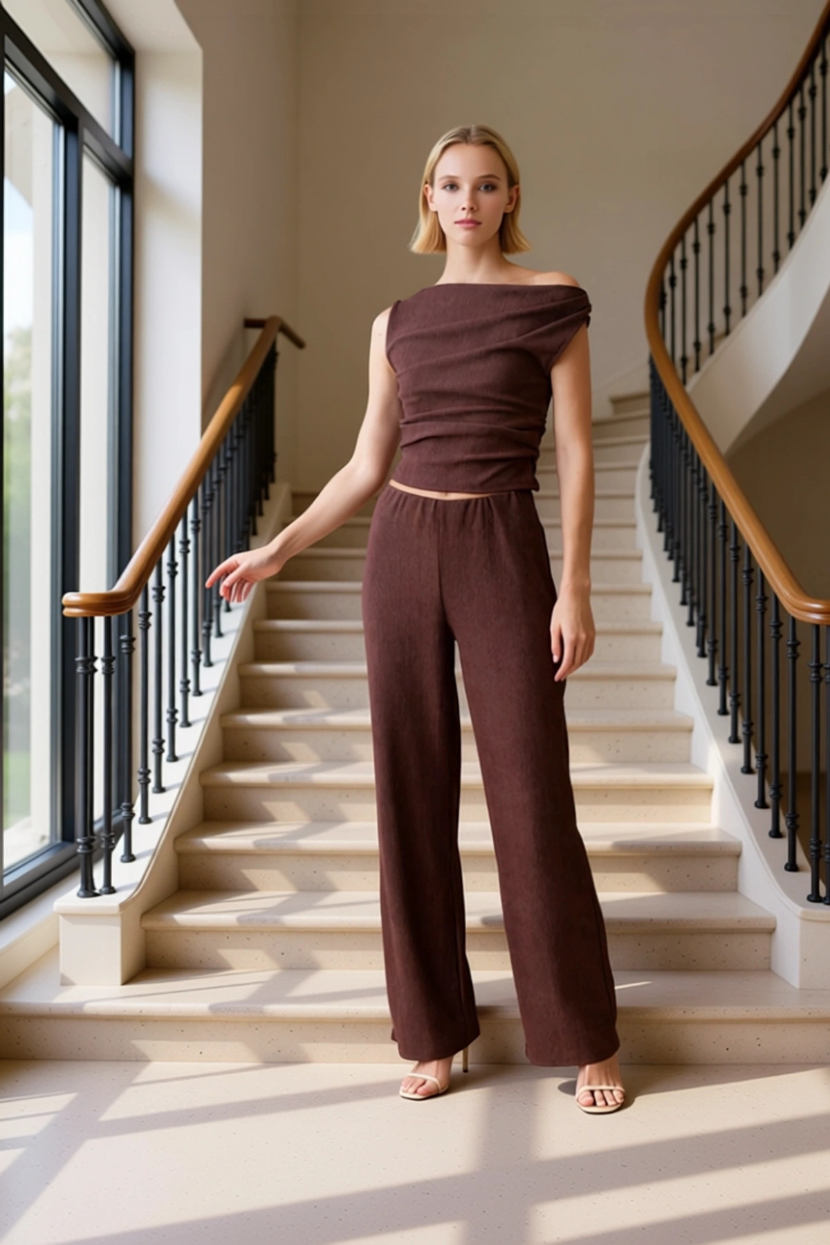 Kadın Alt Üst Carmen Yaka Düşük Kol Bluz Ve Geniş Paça Pantolon Takımı Günlük Şıklık Ve Sunar Spor