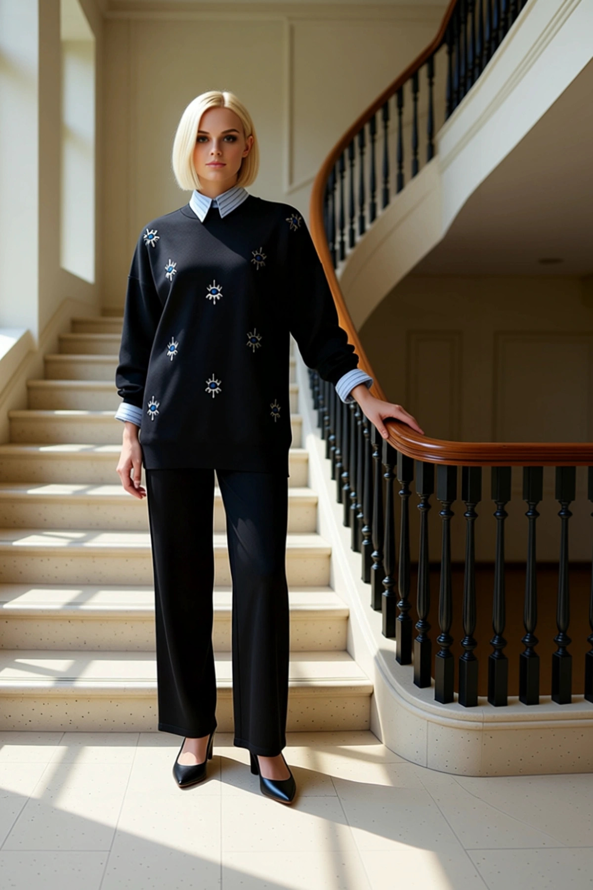Kadın Alt Üst Kalıp Nakış Göz Detaylı Akrilik Triko Kazak Geniş Paça Pantolon Takımı Modern Stil