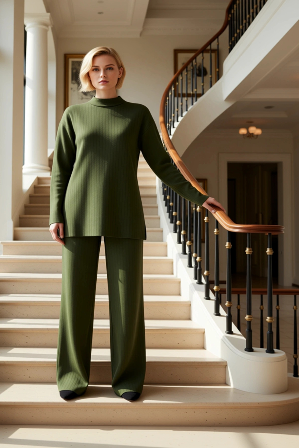 Kadın Alt Üst Dik Yaka Fitilli Örme Üst Ve Flare Paça Rahat Alt Takım Gün Boyu Konforlu Görünüm