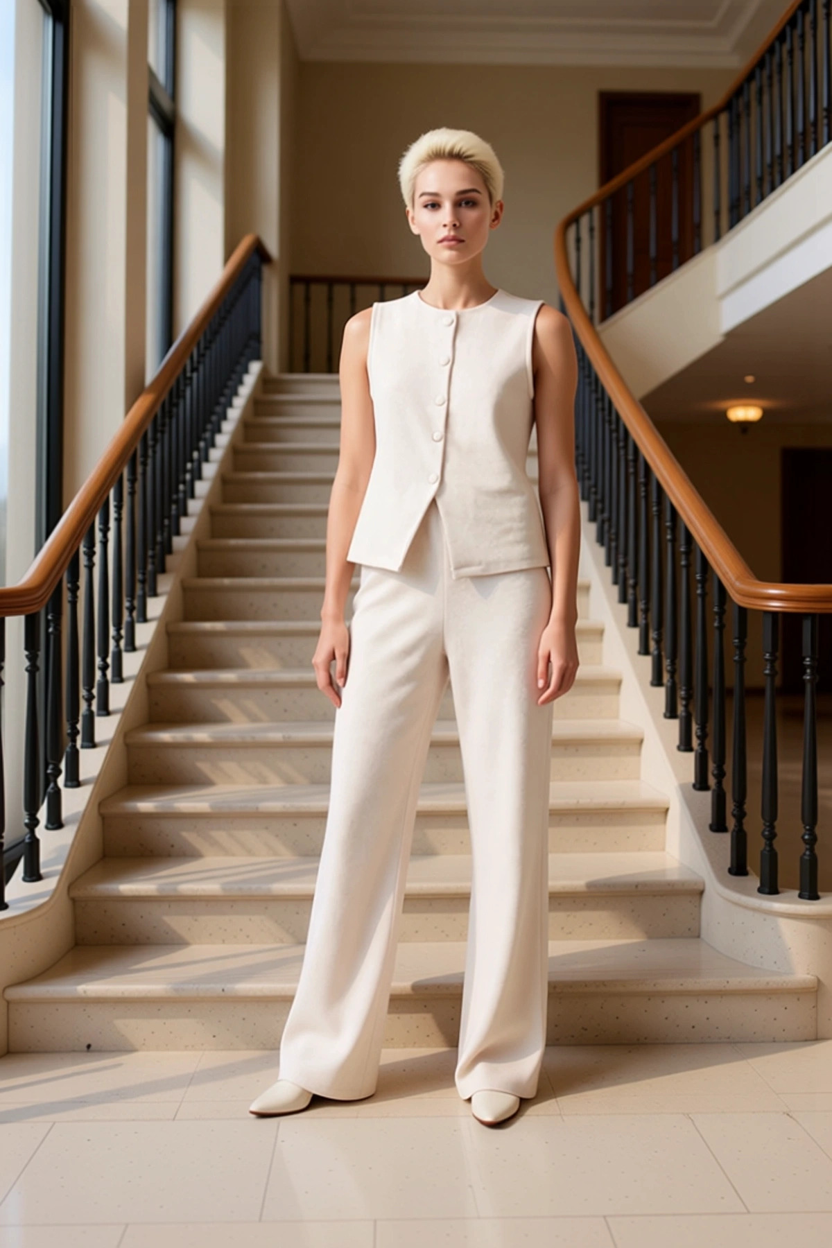 Kadın Alt Üst Selanik Örme Takım Kolsuz Bluz Düğmeli Ön Rahat Kesim Geniş Paça Pantolon Kombini