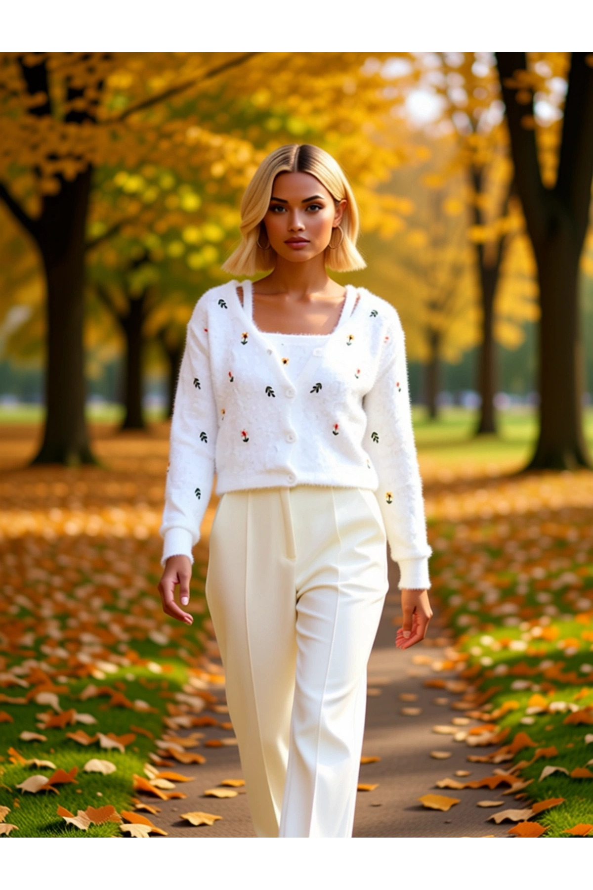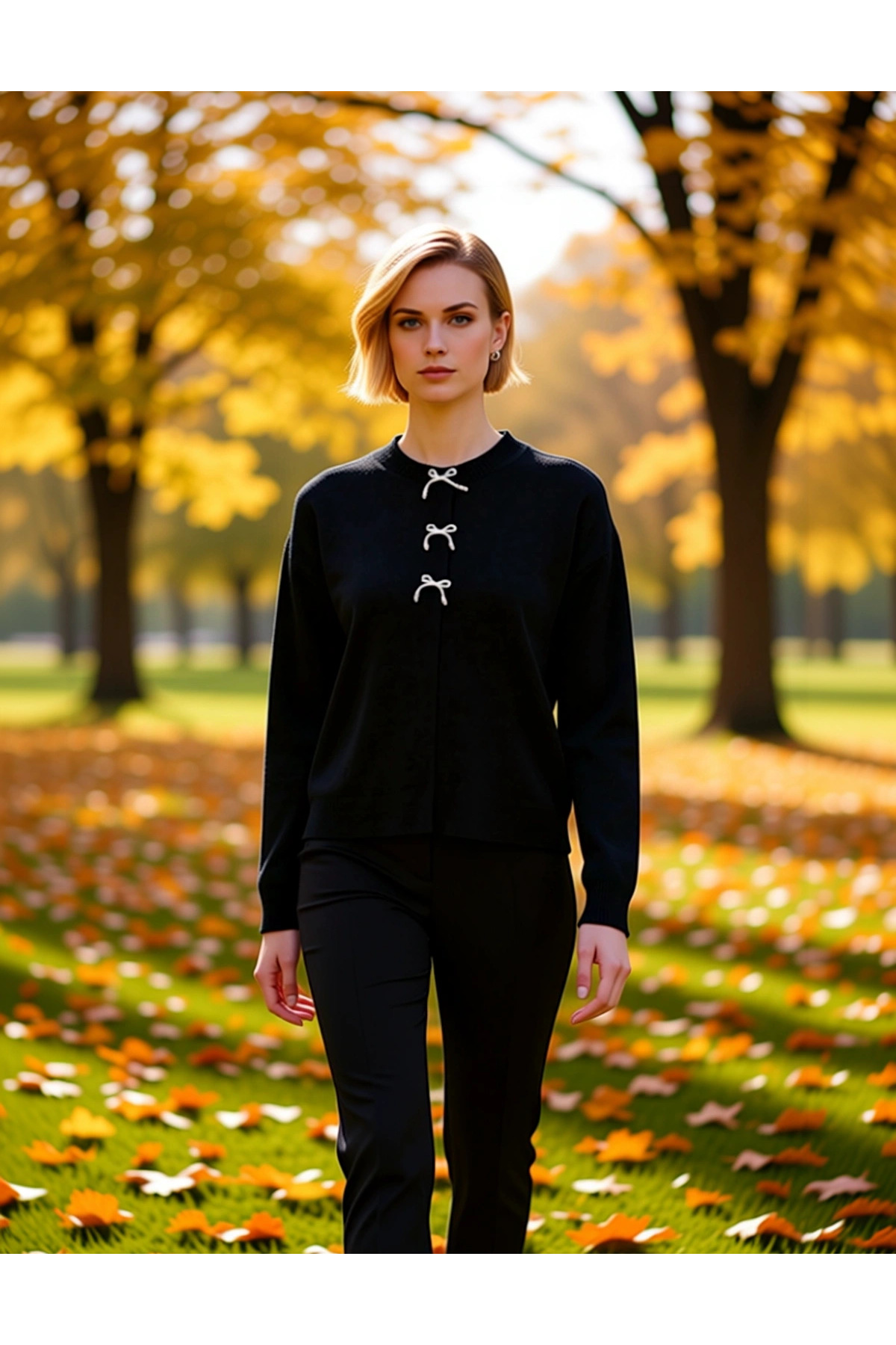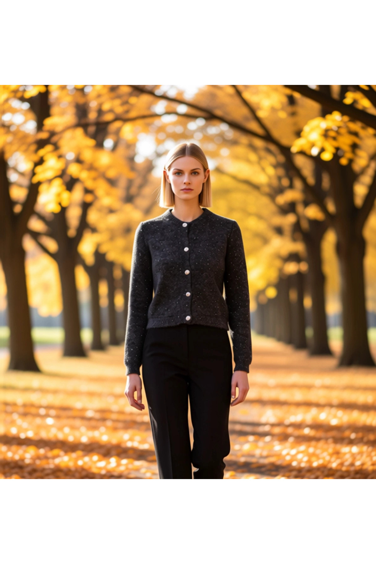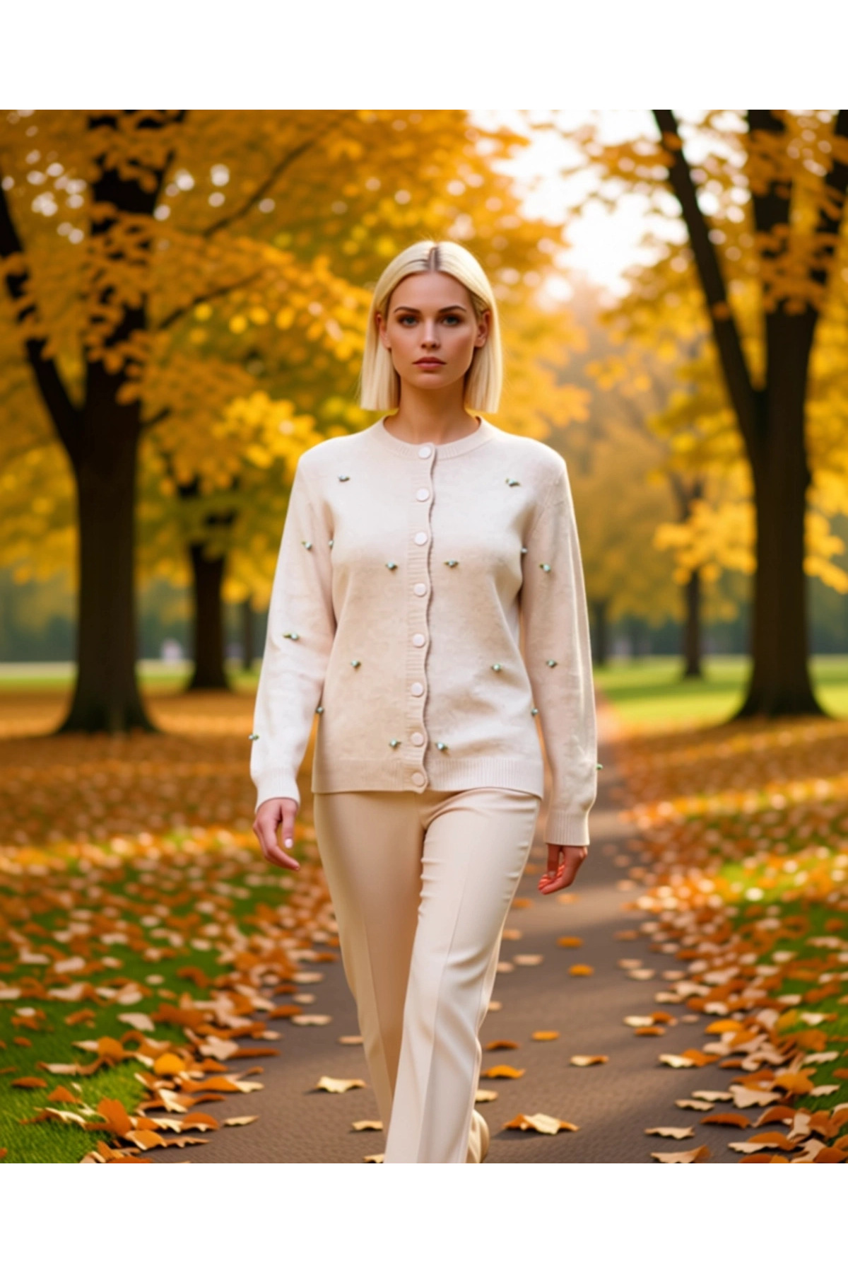 Kadın Fitted Kesim Özel İplikli Bisiklet Yaka Uzun Kollu Triko Hırka Şık Boncuk Aksesuar Detaylı