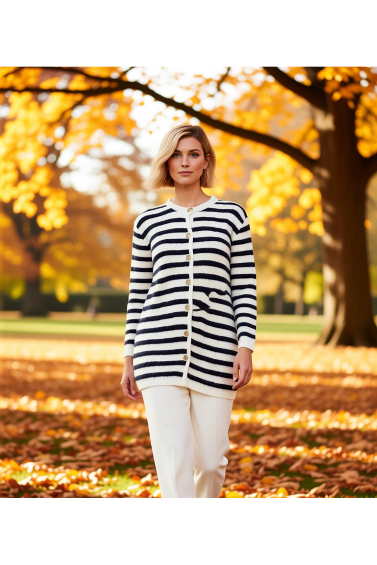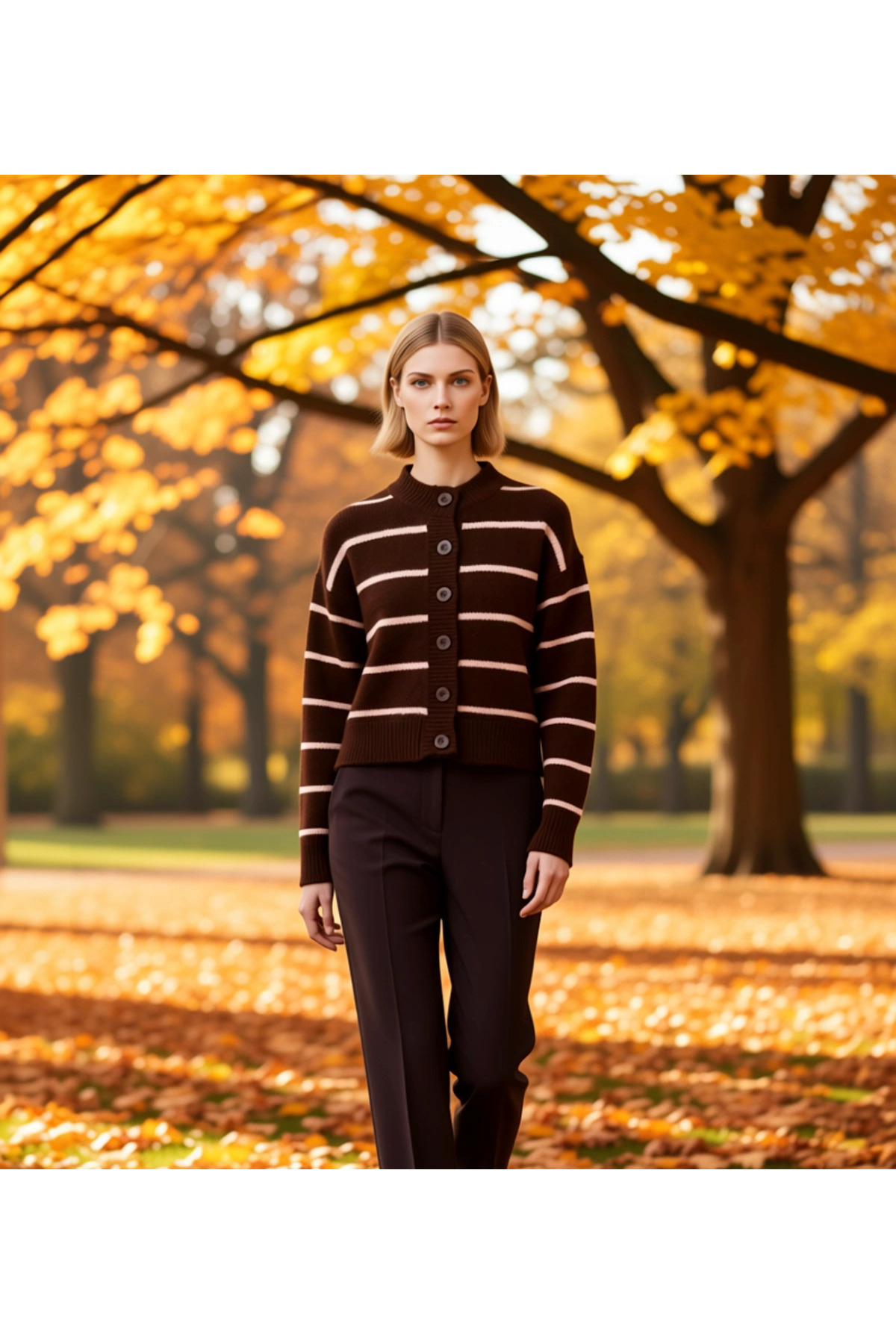Kadın Çizgili Yumuşak Dokulu Bisiklet Yaka Crop Kesim Triko Hırka Düğmeli Ön Detaylı Şık Görünüm