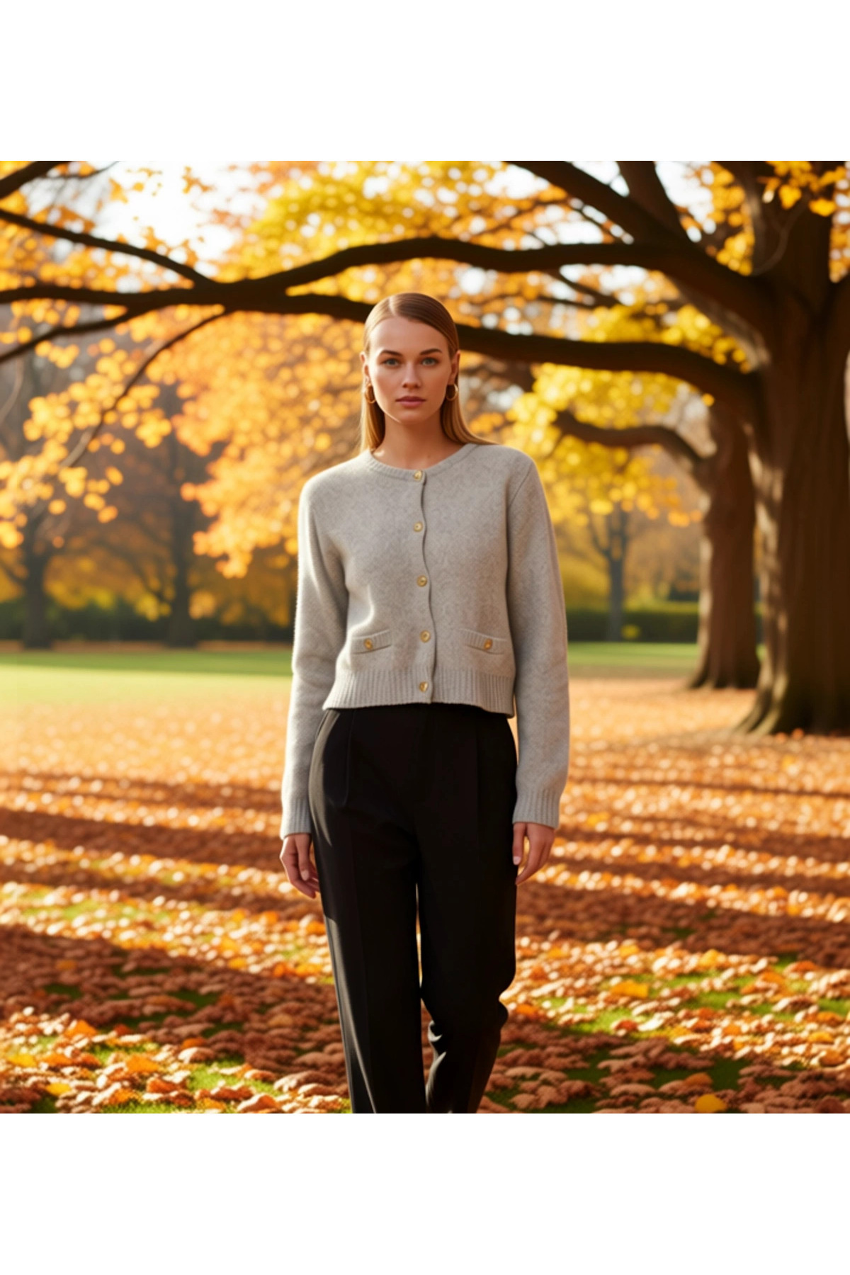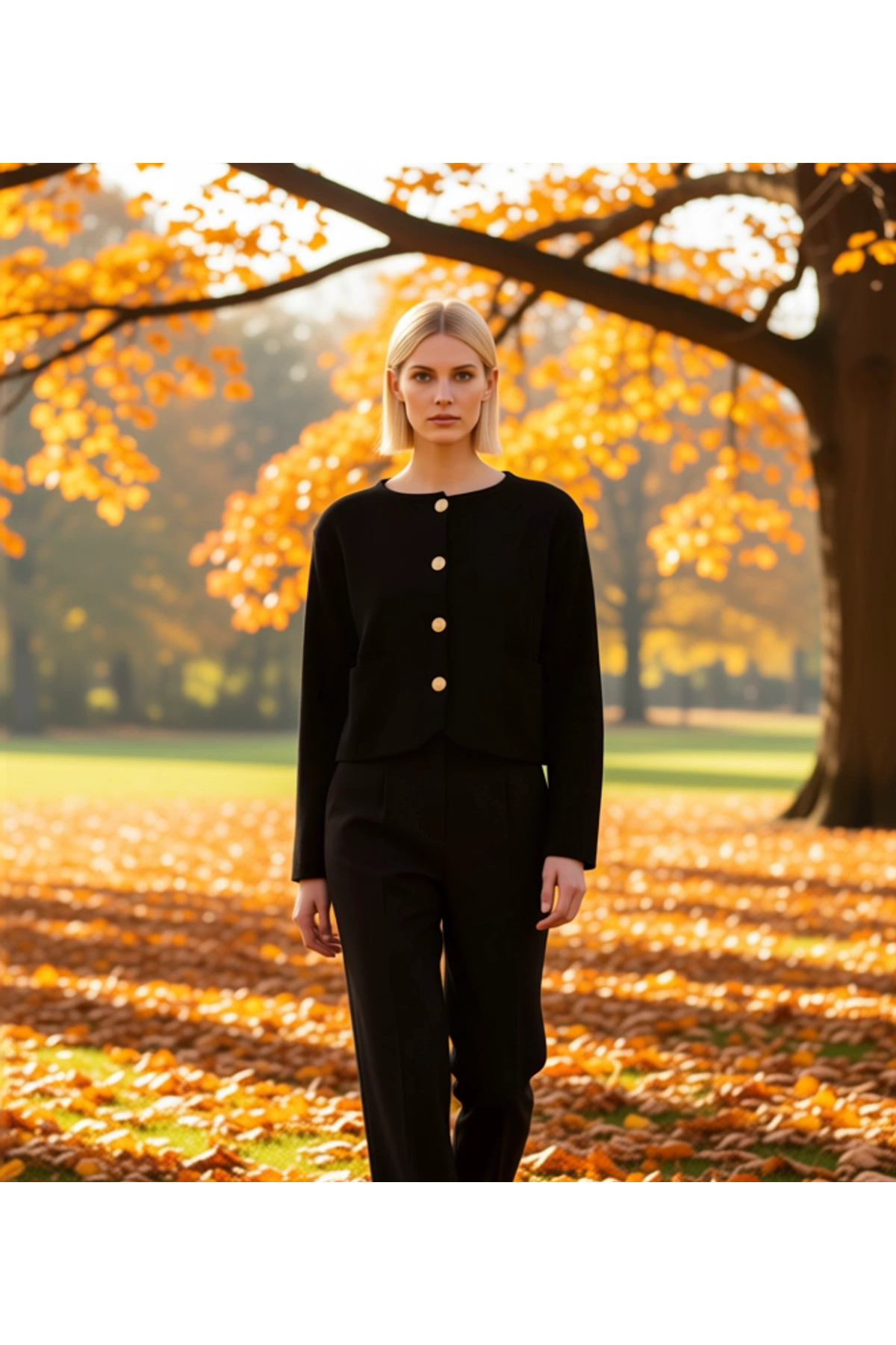 Kadın Premium İplik Crop Triko Hırka Cep Detaylı Düğmeli Uzun Kollu Bisiklet Yaka Casual Şıklık
