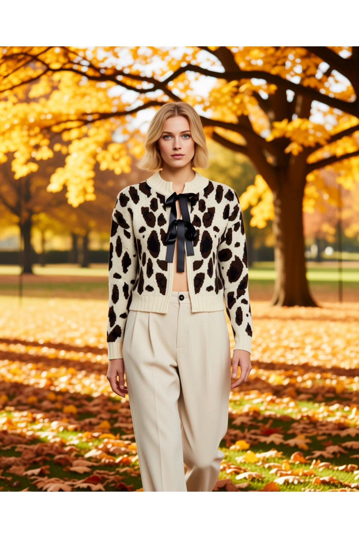 Kadın Leopar Desenli Önü Bağlama Detaylı Yumuşak Dokulu Uzun Kollu Regular Kalıp Crop Triko Hırka