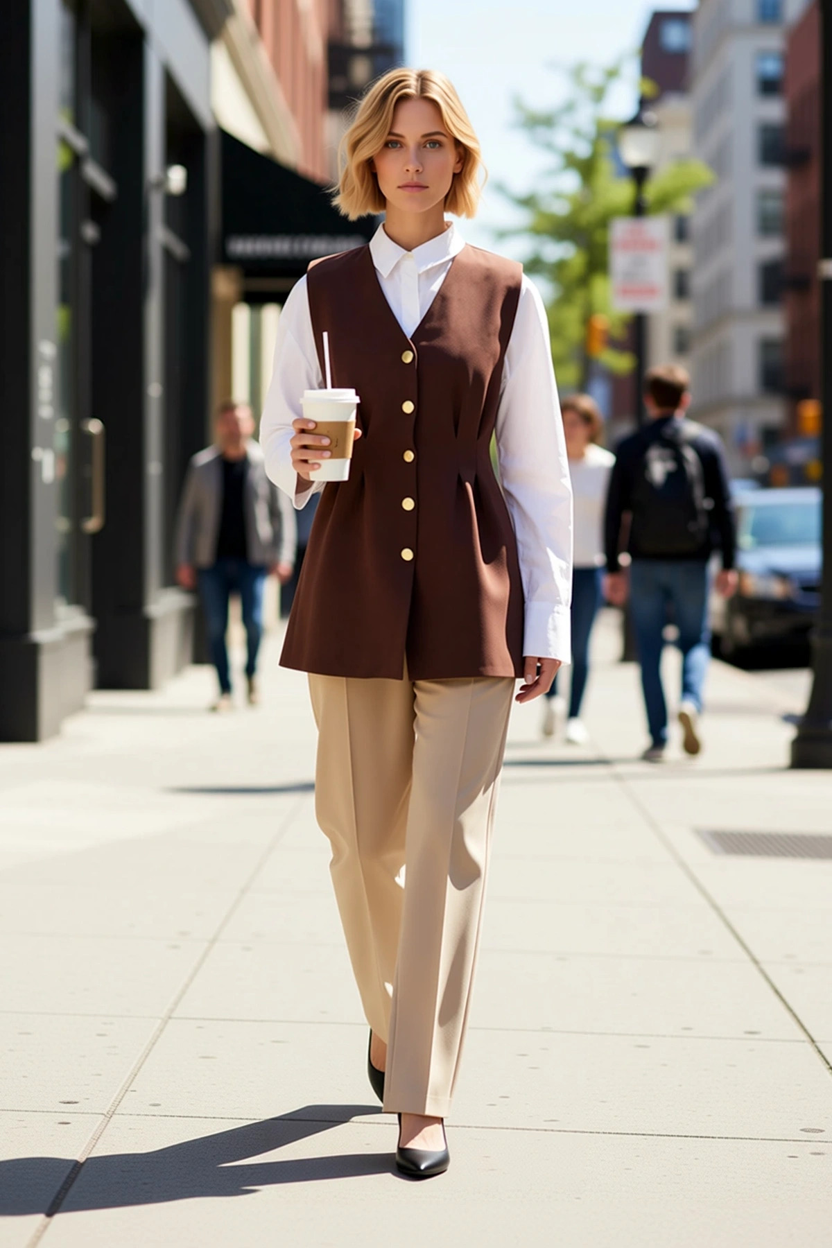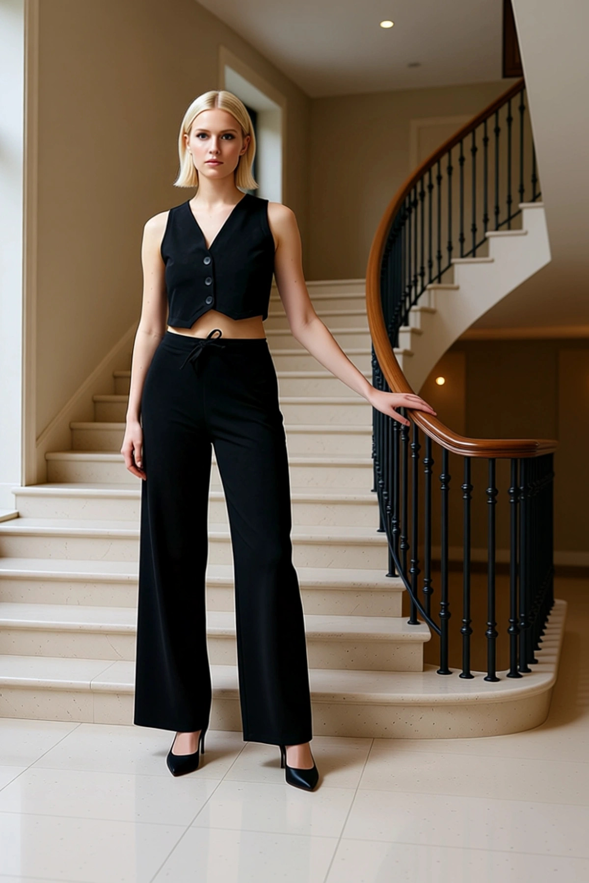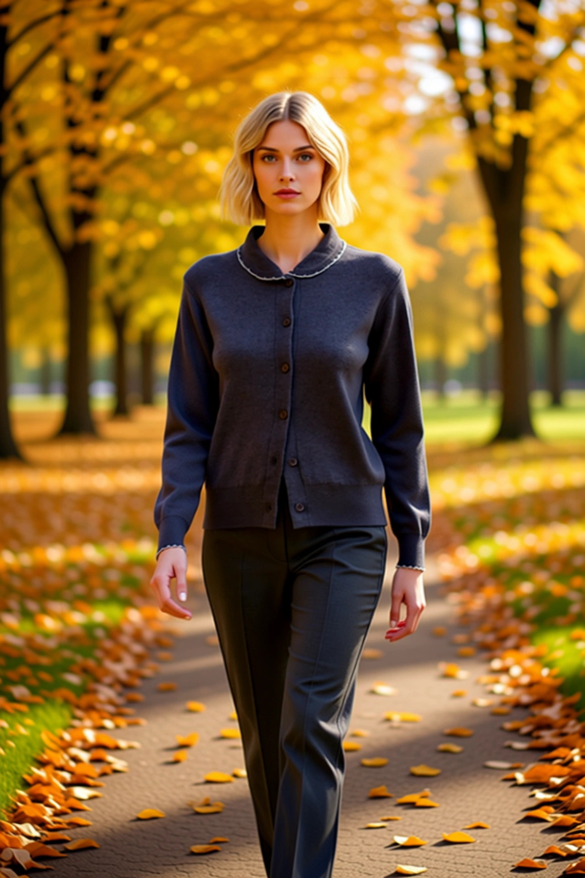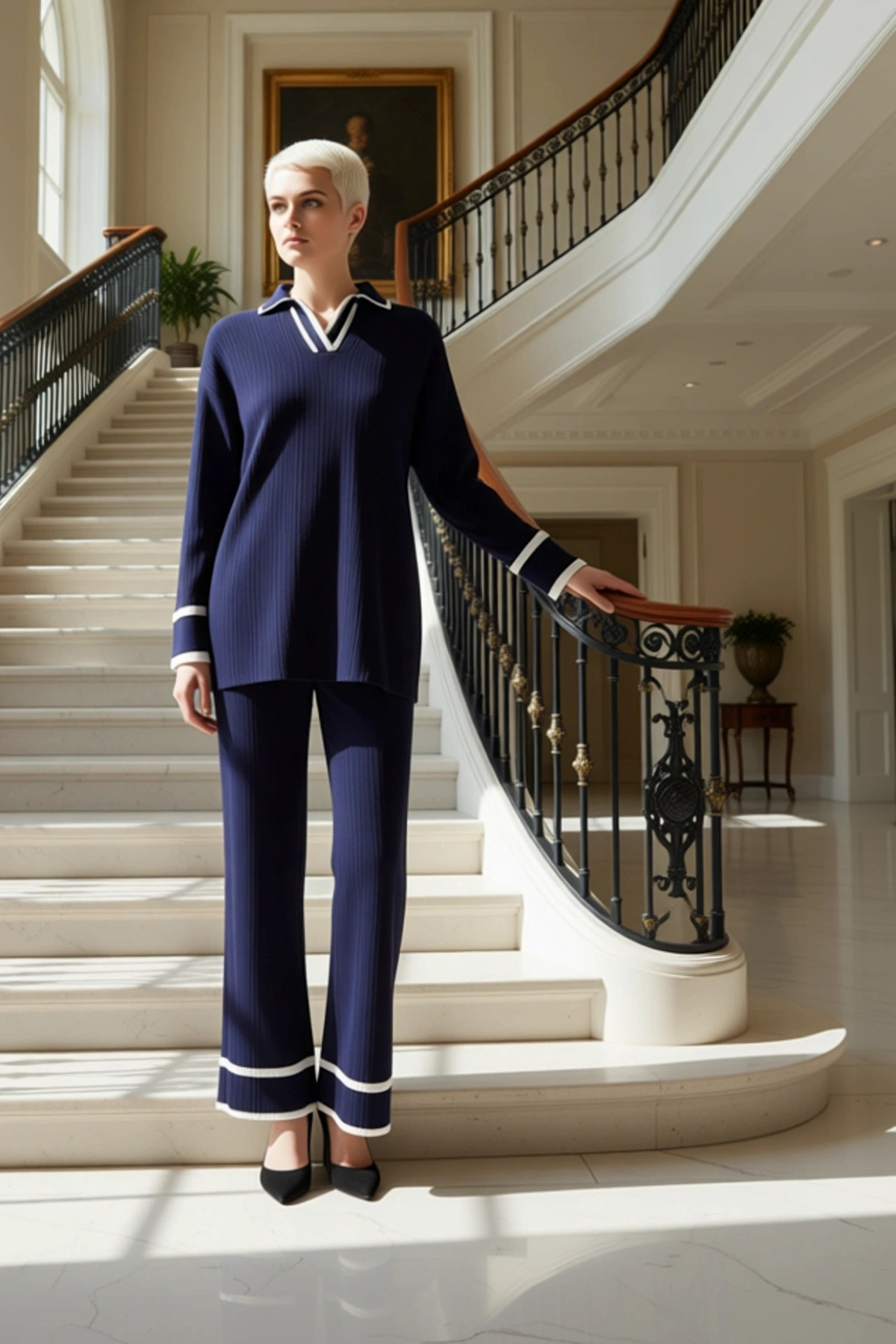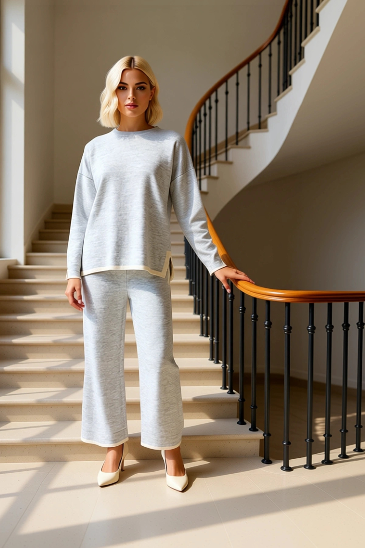 Kadın Alt Üst Triko Polo Yaka Düşük Kol Kazak Geniş Paça Pantolon Takımı Rahat Günlük Giyim Kombini
