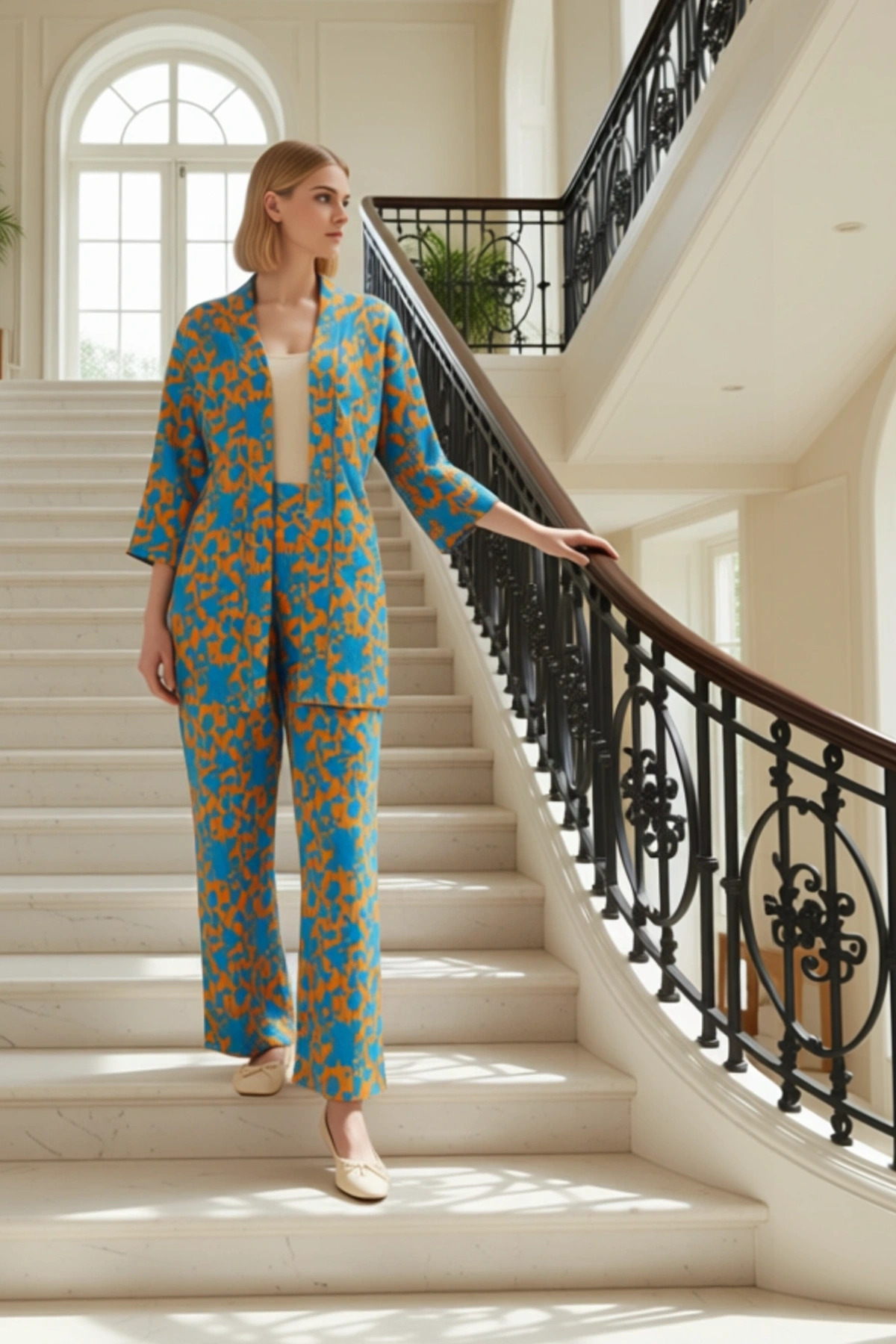 Kadın Alt Üst Şal Desenli Örme Kimono Geniş Paça Pantolon Takımı Yazlık Günlük Konforlu Tasarım