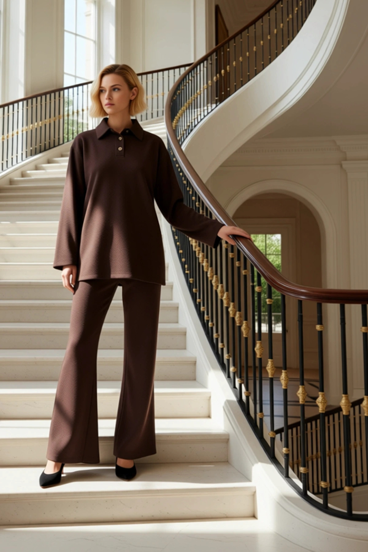 Kadın Alt Üst Geniş Kalıp Fitilli Triko Üst Alt Takım Rahat Kesim Uzun Kollu Henley Yaka Pantolonlu