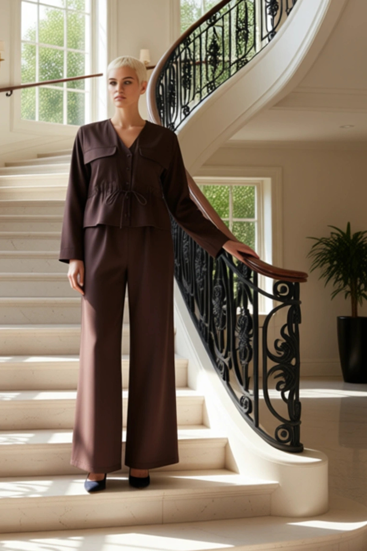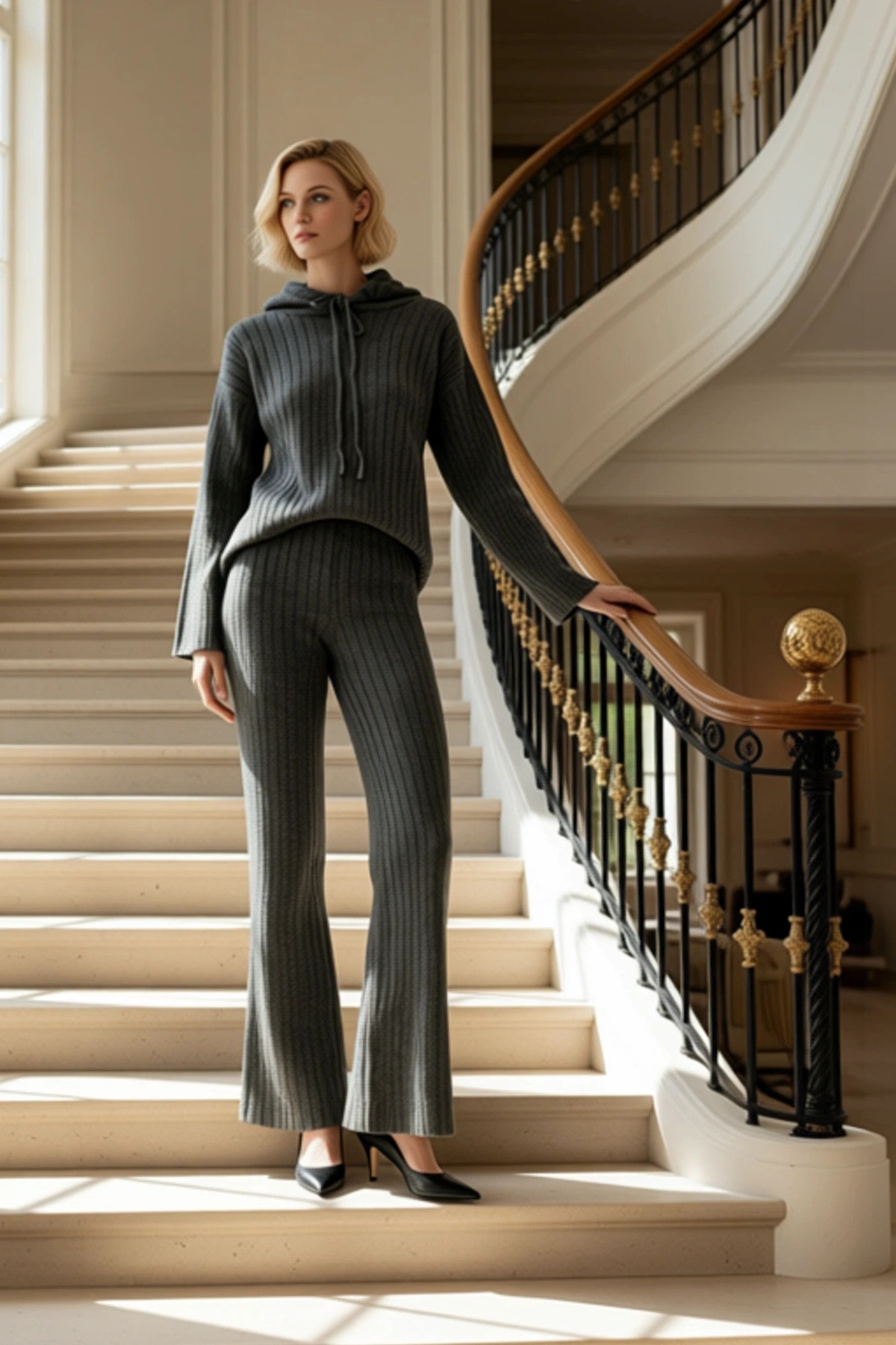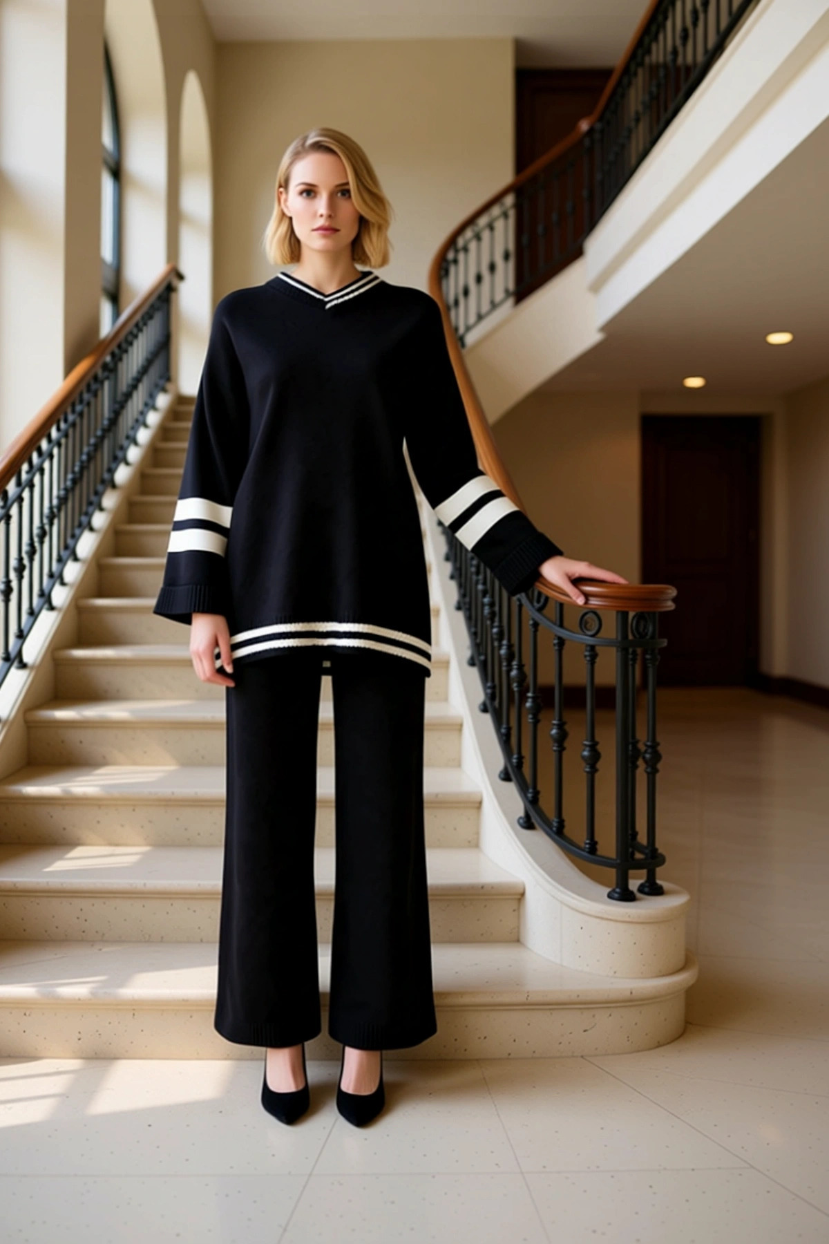 Kadın Alt Üst Rahat Kesim Çizgili Triko Kazak Ve Pantolon Takımı Günlük Şıklık Kombinleri Kaliteli