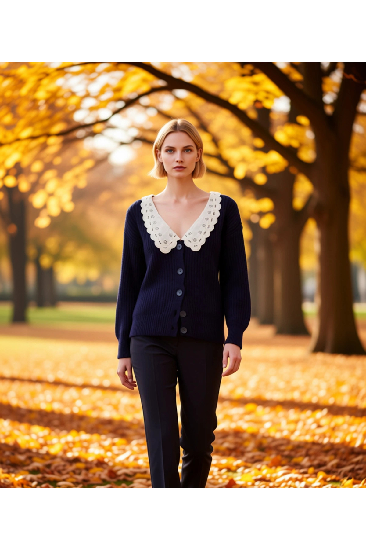 Kadın Gömlek Yaka Garnili İşlemeli Detaylara Sahip Yumuşak Dokulu Geniş Kalıp Balon Kol Triko Hırka