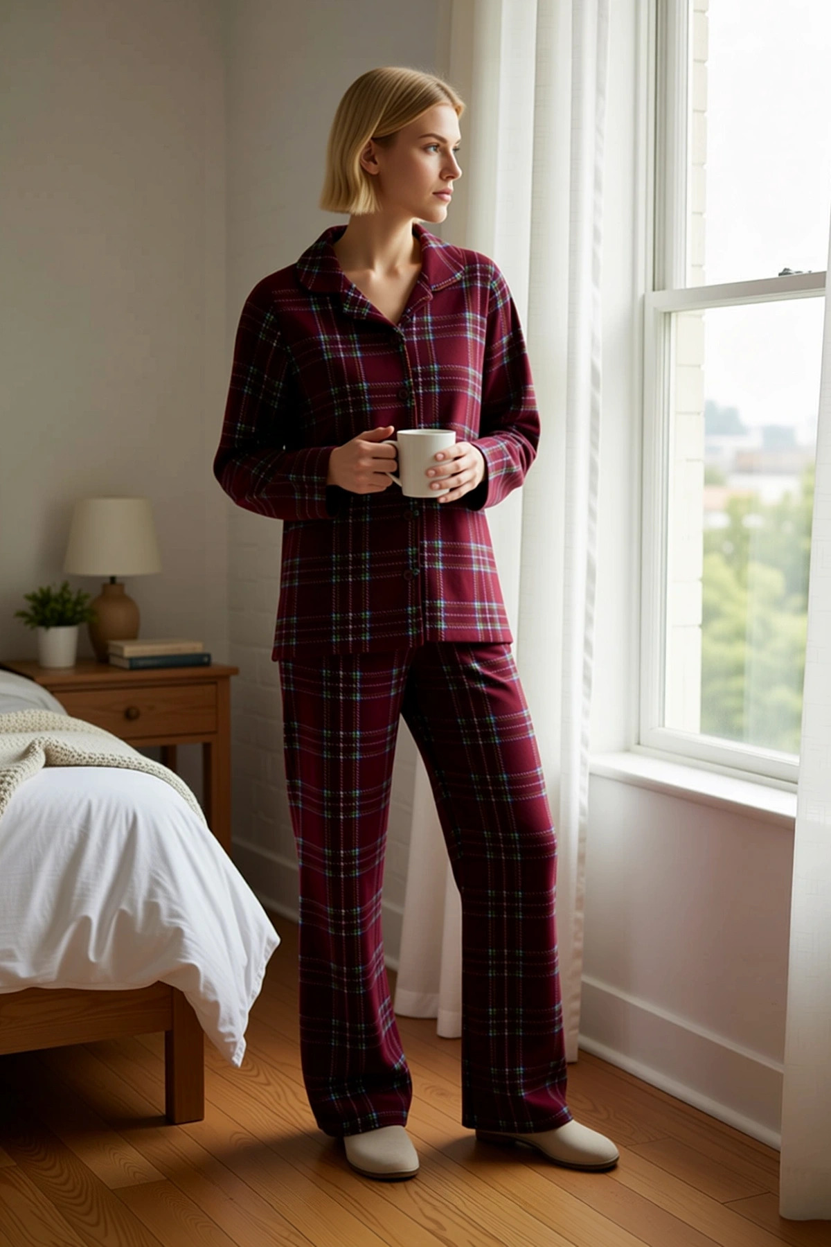 Kadın Büyük Beden Gömlek Yaka Uzun Kol Ekose Polar Pijama Takımı Fonksiyonel Dayanıklı Şık