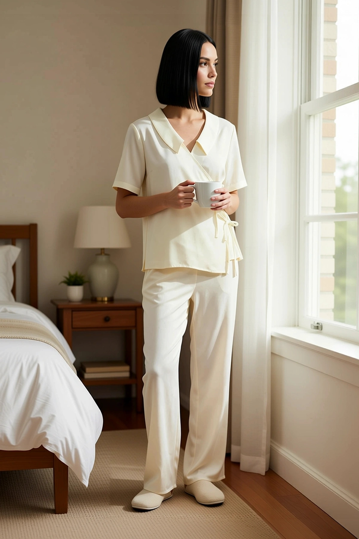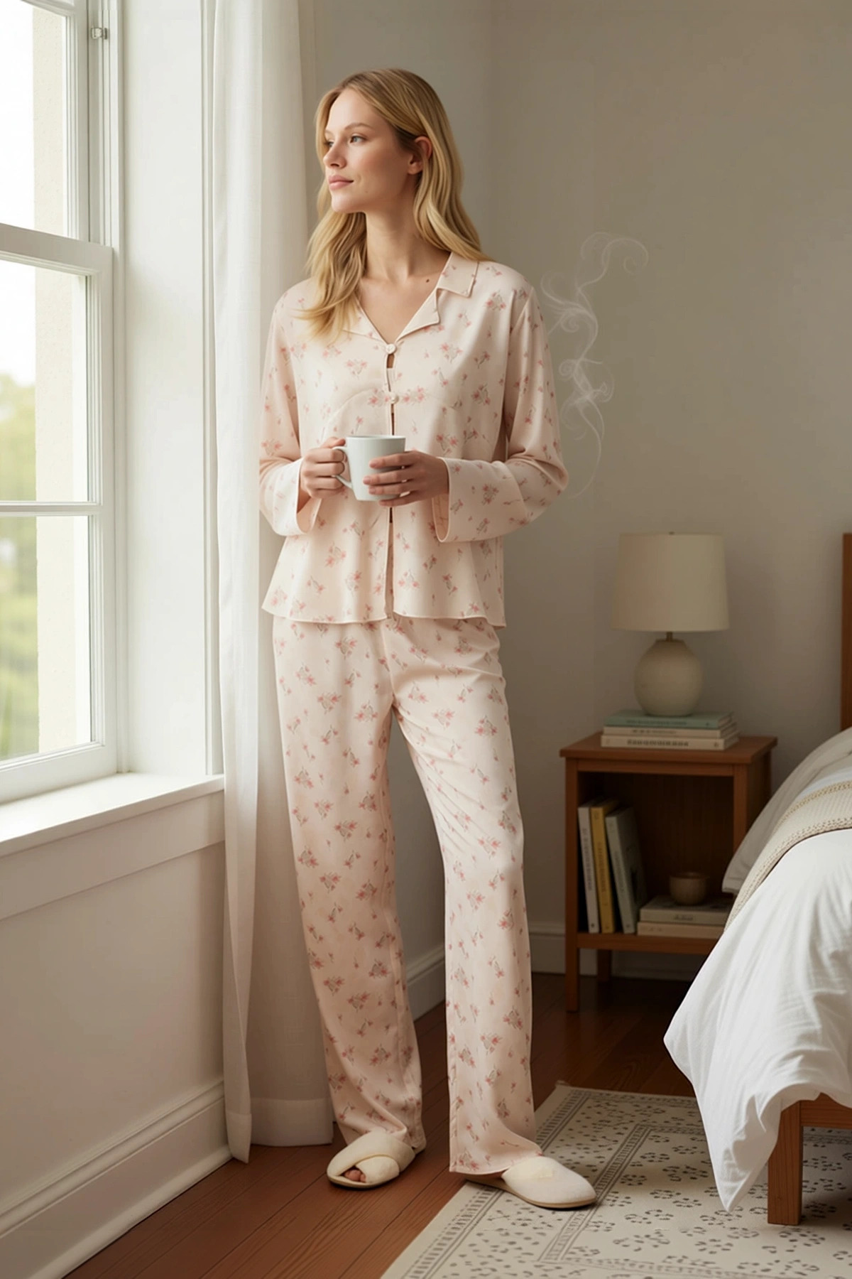 Kadın V Yaka Uzun Kol Regular Kalıp Dokuma Shally Pijama Takımı Fonksiyonel Dayanıklı Spor