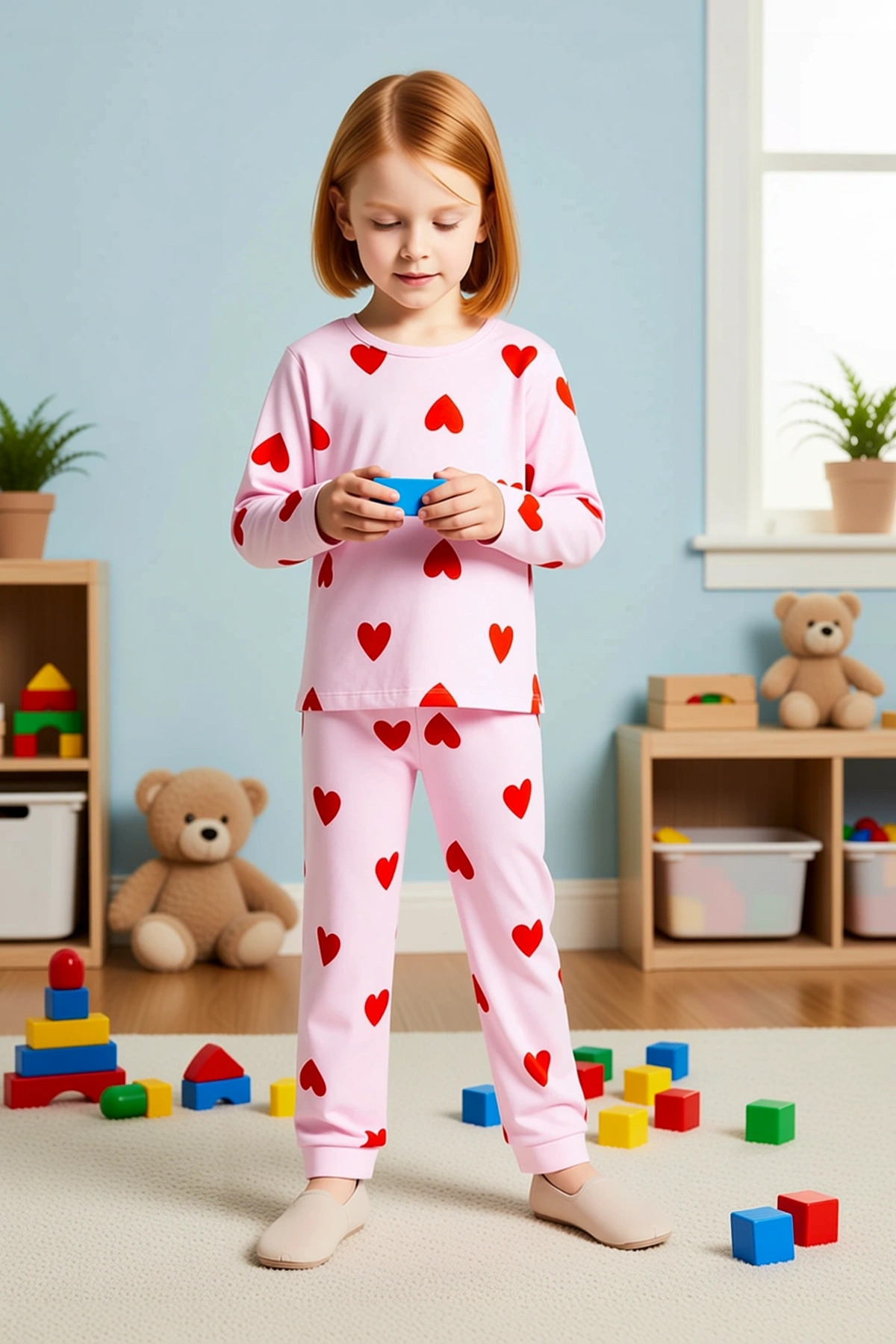 Kız Çocuk Bisiklet Yaka Standart Kol Kalp Baskılı Regular Kız Çocuk Örme Pijama Takımı 0 Pamuk