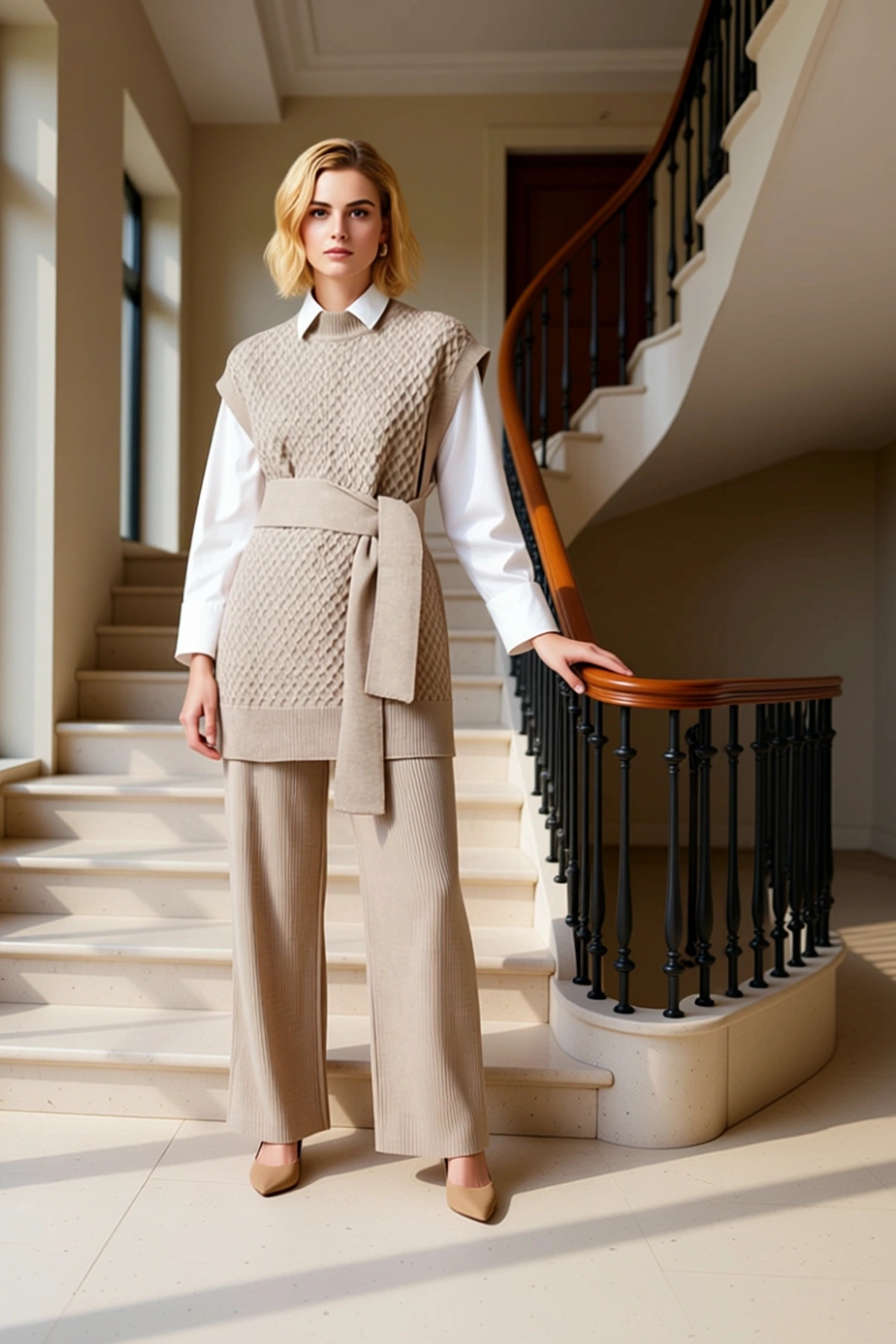 Kadın Alt Üst Kuşak Pirinç Örgü Uzun Süveter Rahat Kesim Geniş Paça Triko Pantolon İkili Takım