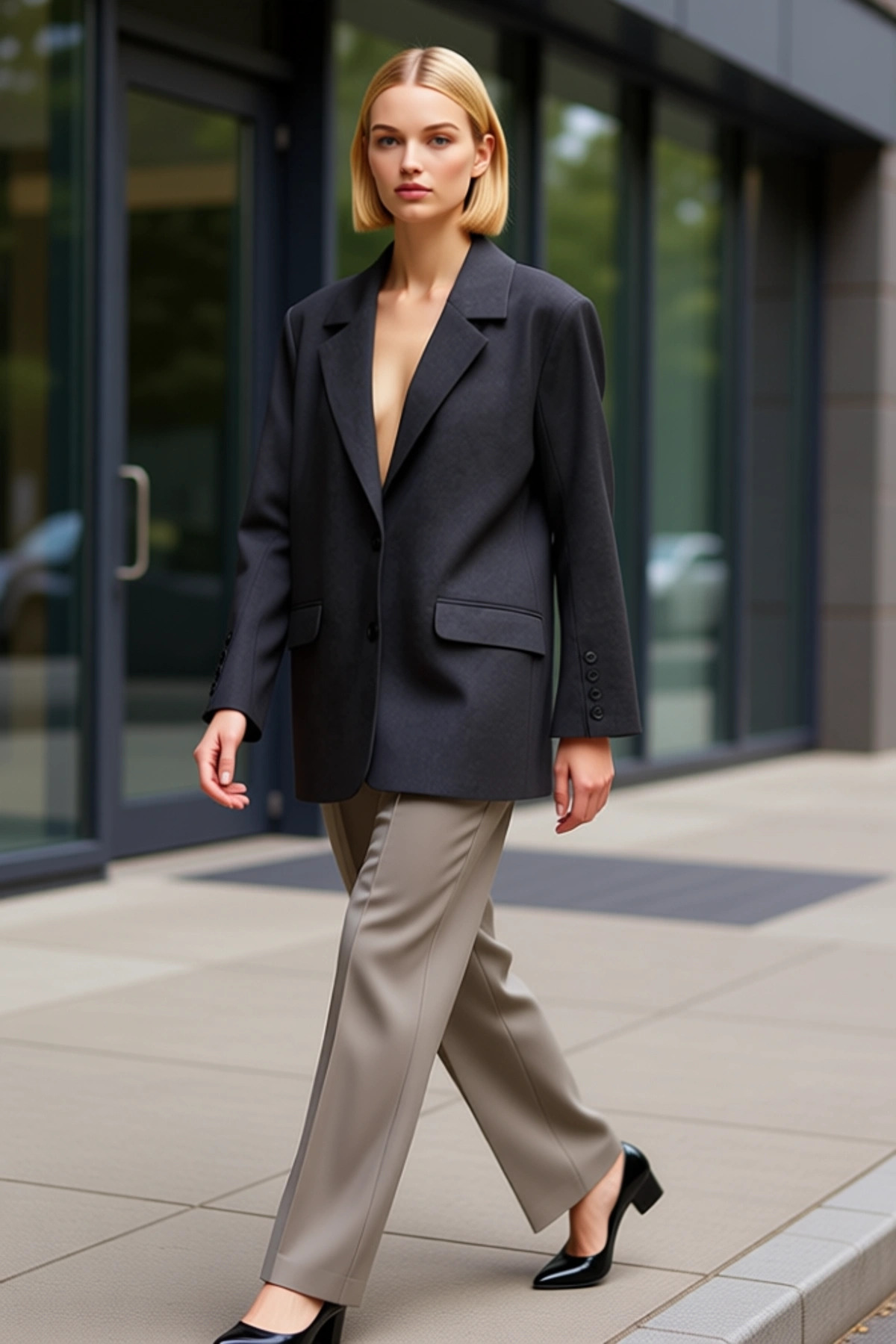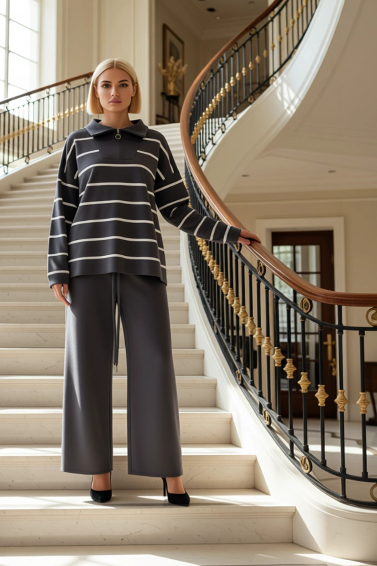 Kadın Alt Üst Çizgili Fermuarlı Yaka Düşük Kol Geniş Kalıp Triko Üst Ve Düz Paça Pantolon Takımı Şık