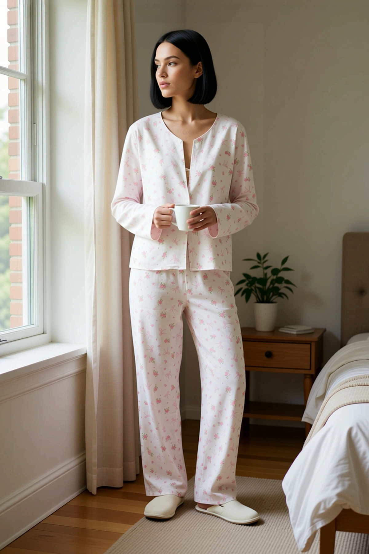 Kadın Müslin Dokuma V Yaka Uzun Kol Regular Kalıp Pijama Takımı Fonksiyonel Şık 0 Pamuk