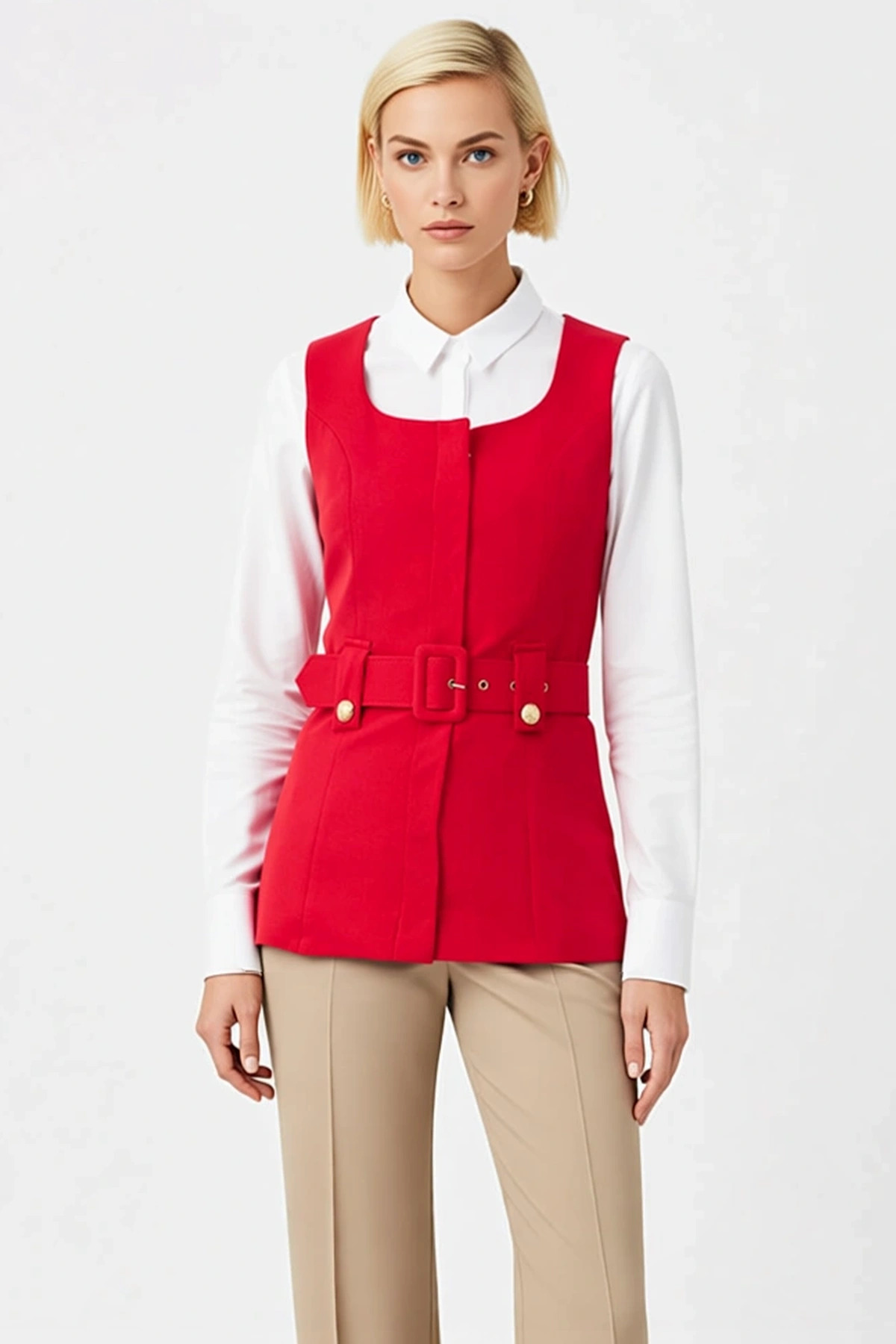 Kadın Havuz Yaka Kolsuz Fitted Uzun Dokuma Yelek Çıtçıt Kapamalı Kemer Detaylı Astarsız Tasarım