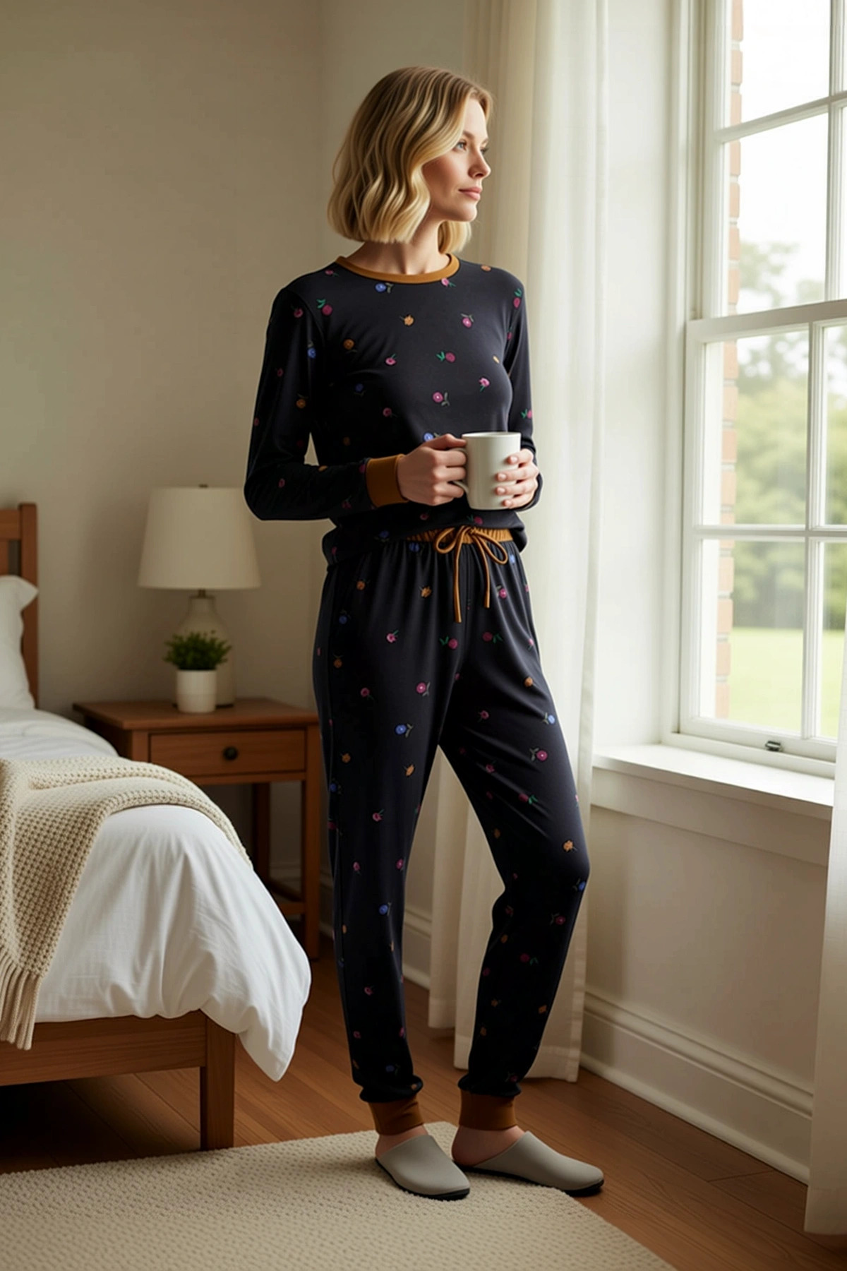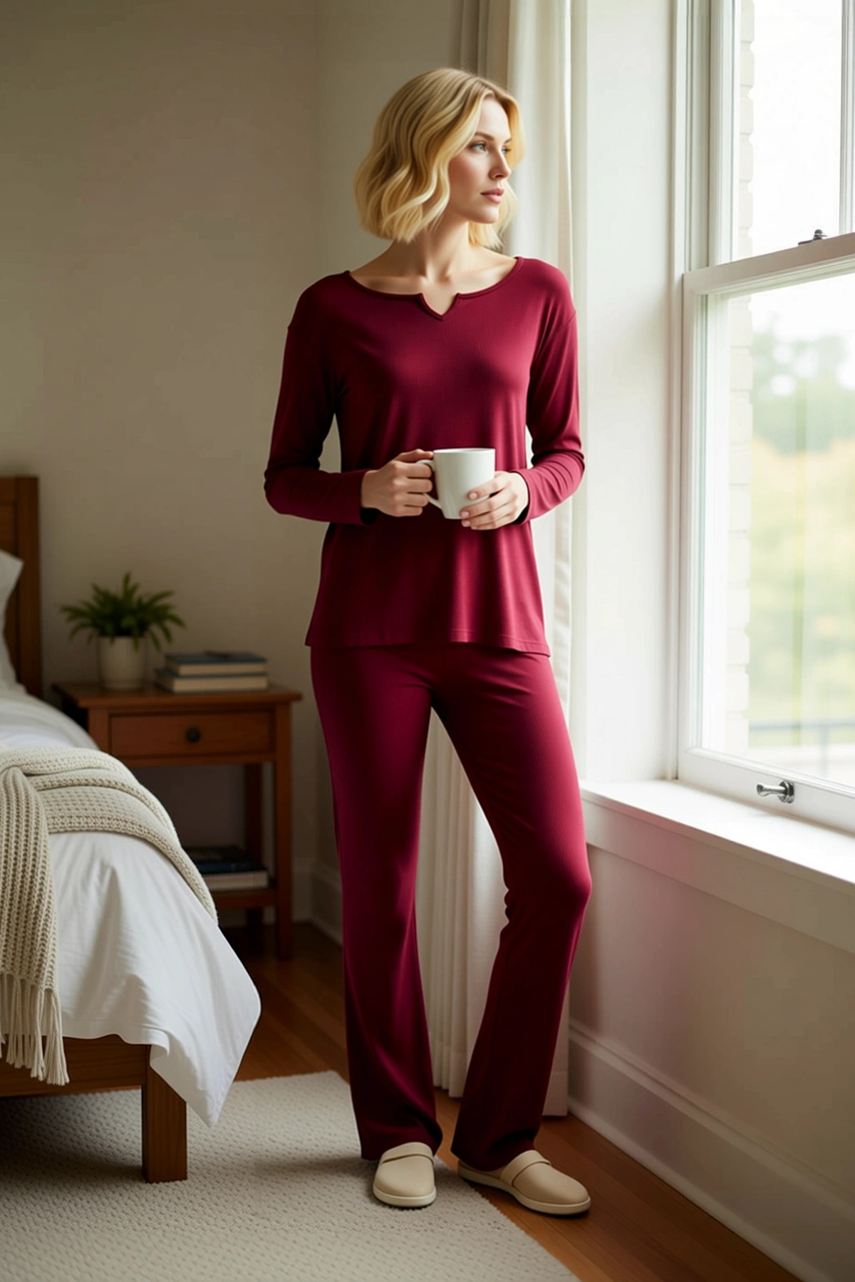 Kadın V Yaka Standart Kol Uzun Kol Kaşkorse Örme Pijama Takımı Fonksiyonel Dayanıklı Rahat