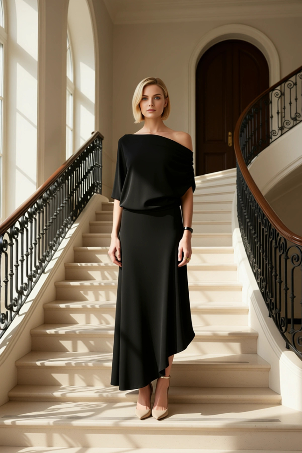 Bu zarif midi elbise, modern ve feminen bir siluet sunar.; Asimetrik yaka detayı, omuzlara zarif bir şekilde dökülerek dikkat çekici bir görünüm oluşturur.; A kesim kalıbı, vücuda nazikçe oturup aşağı doğru genişleyerek rahat bir hareket imkanı sağlar.; Elbisenin kumaşı %97 polyester ve %3 elastan karışımından üretilmiştir, bu da ona hem şık bir duruş hem de hafif bir esneklik kazandırır.; Düz deseni sayesinde her türlü aksesuarla kolayca uyum sağlar ve zamansız bir şıklık sunar.; Astarsız yapısı, özellikle sıcak havalarda kullanım için idealdir ve hafifliği ile konforu ön planda tutar.; Bu elbise, gündüz ve gece etkinliklerinde rahatlıkla tercih edilebilir.; Elbisenin kolsuz tasarımı, yaz ayları için serin bir seçenek sunarken, asimetrik yaka detayı klasik kesimlerden sıyrılan özgün bir stil vadeder.; Dokuma kumaş yapısı, elbisenin formunu korumasına yardımcı olur ve şık bir görünüm sağlar.; Elastan içeriği sayesinde elbise vücuda uyum sağlayarak hareket özgürlüğünü kısıtlamaz, gün boyu süren bir konfor sunar.; Bu elbise, hem özel davetlerde hem de daha casual ortamlarda şıklığınızı tamamlamak için ideal bir parçadır.; Minimalist ve zarif tasarımı, onu gardırobunuzun vazgeçilmez bir parçası haline getirecektir.; Yaz mevsimi için biçilmiş kaftan olan bu elbise, ince topuklu sandaletler ve zarif bir clutch çanta ile mükemmel bir uyum yakalar.; Daha casual bir görünüm için düz tabanlı sandaletler veya espadriller ile de kombinleyebilirsiniz.; Pantolon veya etek ile değil, tek başına bir elbise olarak tasarlanmıştır.; Ürünün bakımı için düşük sıcaklıkta elde yıkama veya hassas programda makinede yıkama önerilir.; Ağartıcı kullanılmamalı ve düşük ısıda ütülenmelidir.