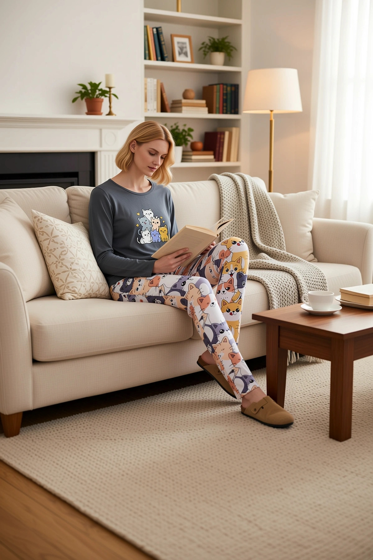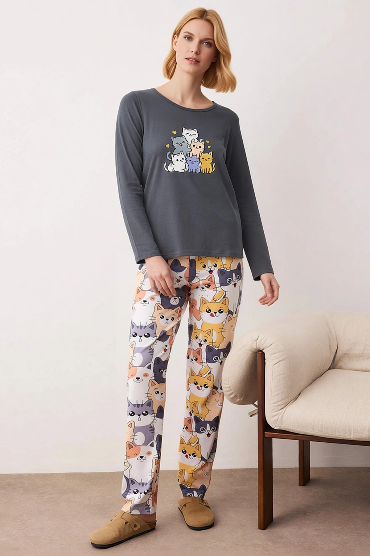 Bu pijama takımı, %96 pamuk ve %4 elastan karışımından üretilmiş örme kumaşıyla hem yumuşak bir dokunuş hem de esnek bir kullanım sunar.; Regular kalıbı sayesinde vücuda tam otururken hareket özgürlüğünü kısıtlamaz.; Üst kısımda yer alan bisiklet yaka ve standart kol detayı, rahat bir kullanım sağlarken, alt kısımda bulunan boru paça pantolon ise klasik bir görünüm sunar.; Ürün, üzerinde sevimli kedi desenleriyle dikkat çekerek ev giyiminize neşeli bir dokunuş katar.; Bu özel tasarım, lounge ve ev ortamlarında konforlu vakit geçirmeniz için idealdir.; Üst parça, bisiklet yaka ve uzun kollu olarak tasarlanmıştır.; Standart kol kesimi, gün boyu rahatlık sunarken, örme kumaşın yumuşaklığı cildinize nazikçe temas eder.; Pantolon ise normal bel ve boru paça kesimi ile modern bir siluet oluşturur.; Elastan içeriği sayesinde kumaşın esnekliği artar, bu da hareket ederken size ekstra konfor sağlar.; Mix baskı tekniğiyle uygulanan kedi desenleri, takımın enerjik ve eğlenceli havasını pekiştirir.; Bu pijama takımı, evde geçirdiğiniz zamanı daha keyifli hale getirmek için özenle tasarlanmıştır.; Kış mevsimi için ideal olan bu pijama takımı, evde rahat bir gün geçirmek için mükemmel bir seçenektir.; Altına rahat bir terlik veya ev ayakkabısı ile kombinleyebilirsiniz.; Üstünüze ise sade bir hırka veya sweatshirt ile tamamlayabilirsiniz.; Pantolon kısmını, düz renk bir tişört ve spor ayakkabı ile gündelik bir görünüm için de kullanabilirsiniz.; Ürünün uzun ömürlü olması için düşük sıcaklıkta ve benzer renklerle yıkanması tavsiye edilir.