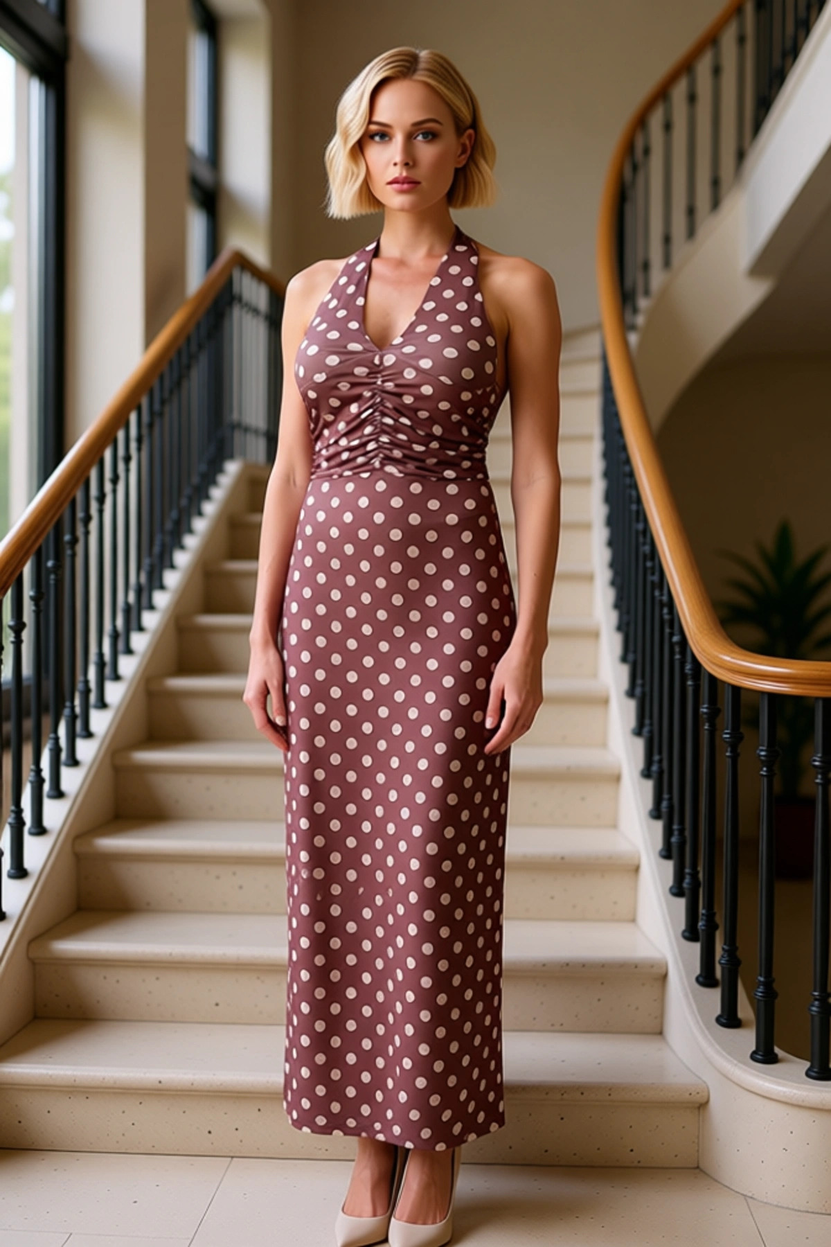 Bu zarif maxi elbise, örme kumaş yapısı ve vücuda oturan kalıbı ile dikkat çekiyor.; %96 polyester ve %4 elastan karışımı sayesinde hem dayanıklı hem de esnek bir yapı sunuyor.; Üzerindeki puantiye deseni, klasik ve zamansız bir görünüm katarken, büzgü ve drape detayları elbiseye modern bir dokunuş ekliyor.; Astarsız tasarımı, sıcak havalarda rahat bir kullanım sağlıyor.; Bu özel tasarım, gündüz ve gece etkinliklerinde şıklığınızı ön plana çıkaracak.; Elbisenin kolsuz ve boyundan bağlamalı yaka detayı, zarif bir siluet oluşturuyor.; Standart kol tipi, rahat bir hareket özgürlüğü sunarken, bodycon kalıbı vücut hatlarını güzelce vurguluyor.; Kalın sandy dokuma tipi, elbiseye hoş bir doku kazandırıyor.; Bu elbise, hem şık hem de konforlu bir seçenek arayan kadınlar için ideal.; Günlük kullanımda veya özel davetlerde rahatlıkla tercih edilebilir.; Ürün, akıllı bir persona ile tasarlanmış olup, her ortamda dikkat çekmenizi sağlayacak.; Yaz mevsimi için ideal olan bu elbise, yüksek bel pantolonlar, mini etekler ve şık sandaletlerle mükemmel bir uyum sergiler.; Ayrıca topuklu ayakkabılarla tamamlayarak gece davetleri için de kullanabilirsiniz.; Elbisenin bakımı için özel talimatlara uyulması önerilir.; Bu ürün, gardırobunuza ekleyebileceğiniz şık ve kullanışlı bir parçadır.