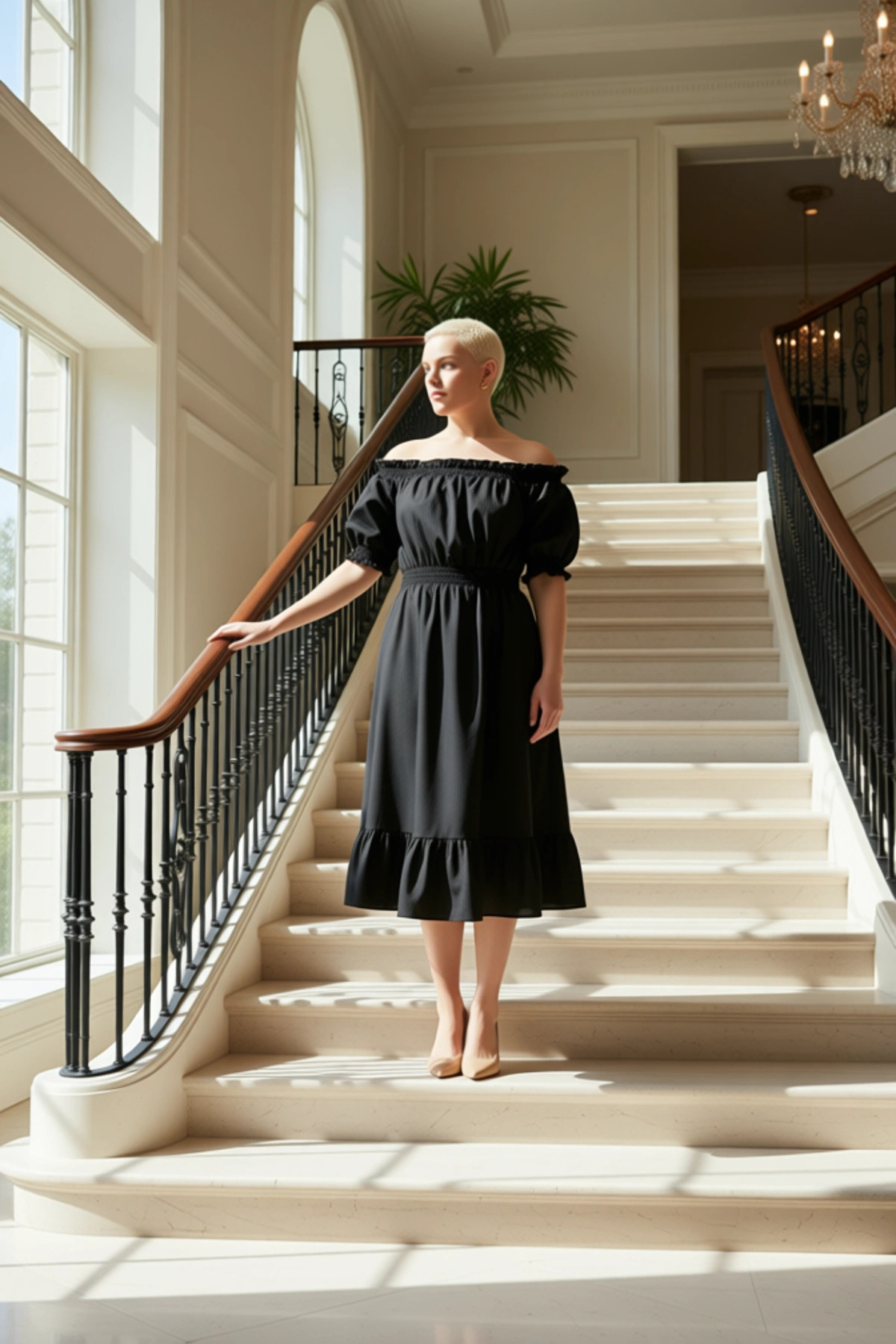 Bu midi elbise, %58 pamuk ve %42 polyester karışımı kumaşı ile hem nefes alabilir hem de dayanıklıdır.; A-kesim kalıbı, vücuda nazikçe oturan ve rahat bir hareket imkanı sunan bir siluet oluşturur.; Düz deseni, zarif ve zamansız bir görünüm sağlarken, shally dokuma tipi kumaşa hoş bir doku katmaktadır.; Astarsız yapısı, özellikle sıcak havalarda serin bir kullanım sunar.; Bu elbise, günlük kullanım için idealdir ve feminen bir duruş sergiler.; Elbisenin Carmen yaka detayı, omuzları açıkta bırakarak çekici bir görünüm sunar.; Balon kol tasarımı, hem modern hem de feminen bir hava katarken, kısa kol boyu yaz ayları için pratiktir.; Elbisenin genel kesimi, rahatlığı ön planda tutarak gün boyu konfor sağlar.; Büzgülü bel detayı, bedeni vurgulayarak daha fit bir görünüm elde edilmesine yardımcı olur.; Bu elbise, hem şık hem de rahat bir seçenek arayanlar için mükemmel bir tercihtir.; Yaz mevsimi için ideal olan bu elbise, keten pantolonlar, denim etekler veya şortlarla rahatlıkla kombinlenebilir.; Ayakkabı olarak ise sandaletler, espadriller veya b veya babetler tercih edilebilir.; Elbisenin bakımı için, düşük sıcaklıkta ve hassas programda yıkanması önerilir.; Ağartıcı kullanılmamalı ve düşük ısıda ütülenmelidir.