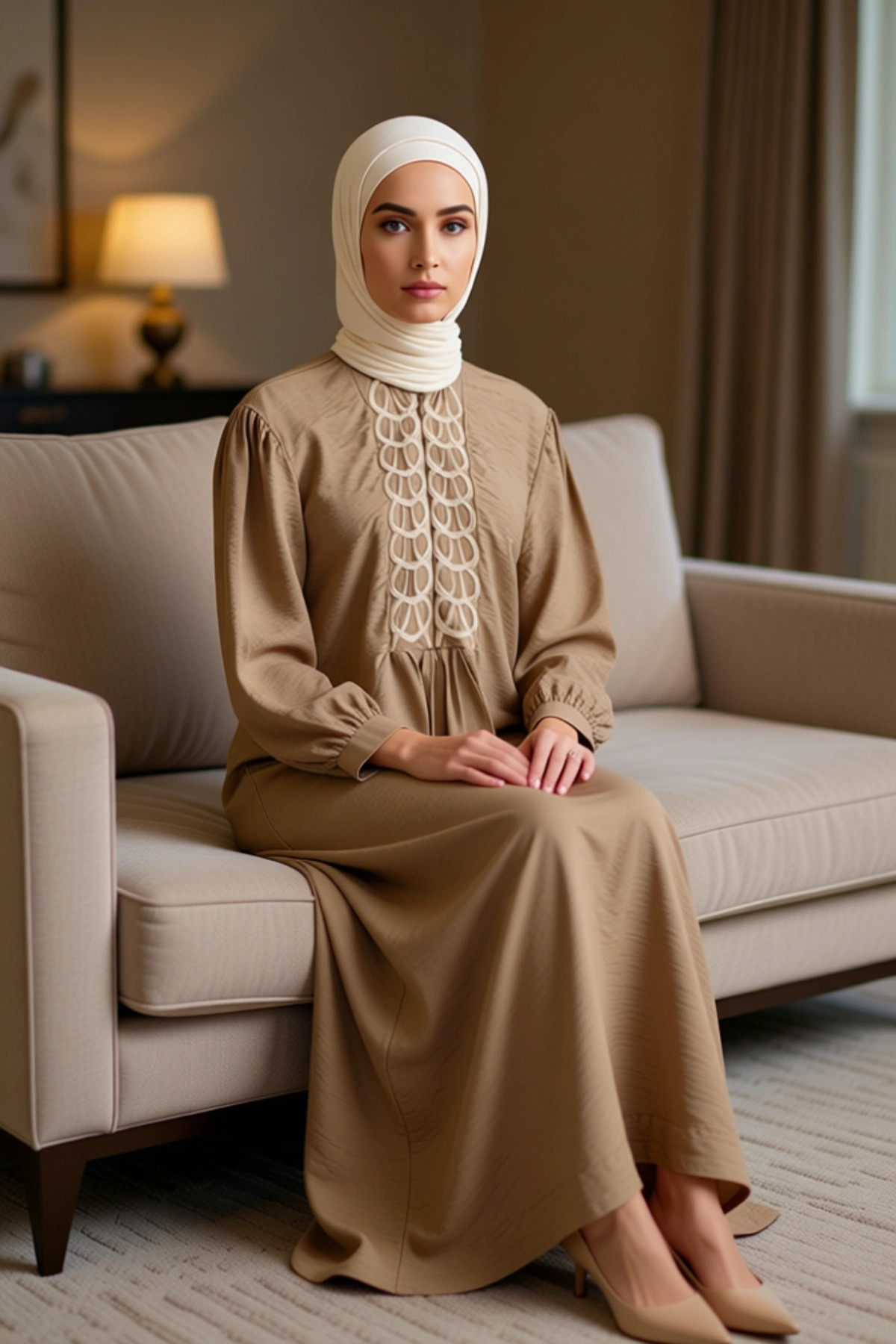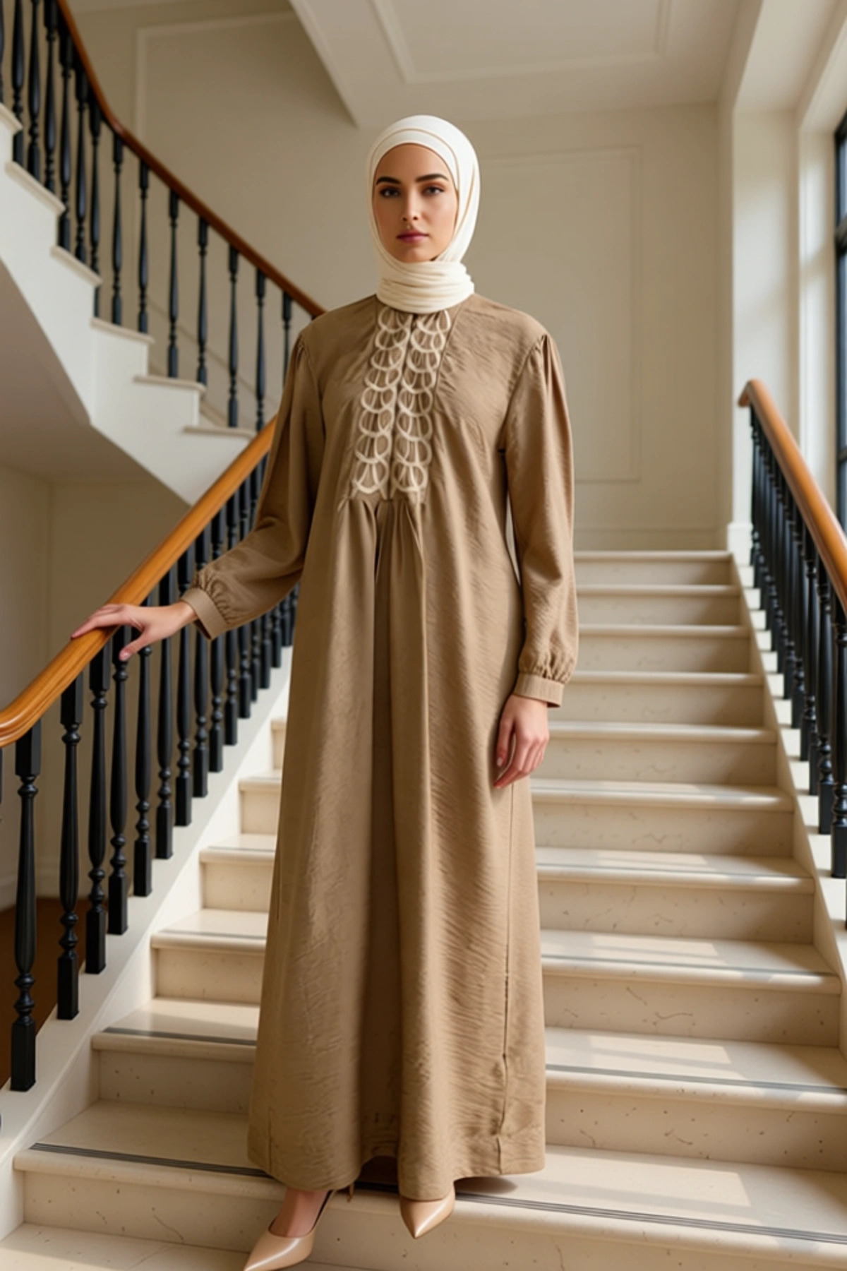 Bu zarif elbise, A-kesim kalıbı ile vücut hatlarını nazikçe sararak rahat bir kullanım sunar.; %70 polyester ve %30 pamuk karışımından üretilen dokuma kumaşı, ağaç kabuğu dokusuyla hem şık hem de dayanıklıdır.; Üzerindeki zarif nakış detayları, elbiseye otantik bir hava katarken, astarsız yapısı sayesinde özellikle sıcak havalarda ferahlık sağlar.; Fermuar detayı, giyim kolaylığı sunarken, maxi boyu ve genel tasarımıyla modern bir görünüm elde etmenizi sağlar.; Bu elbise, günlük kullanım için ideal olup, kumaşının dokusu ve işçiliğiyle öne çıkar.; Elbisenin dik yaka detayı, boyun bölgesine zarif bir vurgu yaparken, balon kol tasarımı hareket özgürlüğü sunar.; Uzun kol boyu, serin akşamlarda veya daha kapalı bir stil arayanlar için uygundur.; A-line silueti, her vücut tipine uyum sağlayarak konforlu bir deneyim sunar.; Fermuar detayı, elbiseyi kolayca giyip çıkarmayı sağlarken, genel olarak cool ve comfort persona ile uyumlu bir tasarıma sahiptir.; Bu elbise, hem şıklığı hem de rahatlığı bir arada arayan kadınlar için mükemmel bir seçenektir.; Dokuma kumaşının hafifliği ve dökümlü yapısı, gün boyu kendinizi iyi hissetmenizi sağlar.; Yaz mevsimi için ideal olan bu elbise, keten pantolonlar, salaş etekler veya şık sandaletlerle kolayca kombinlenebilir.; Günlük bir görünüm için spor ayakkabılarla da tercih edilebilir.; Elbisenin bakımı için ağartıcı kullanmaktan kaçınılmalı ve düşük ısıda ütülenmesi önerilir.; Bu elbise, hem şık hem de rahat bir stil arayanlar için dolaplarında mutlaka bulunması gereken bir parçadır.