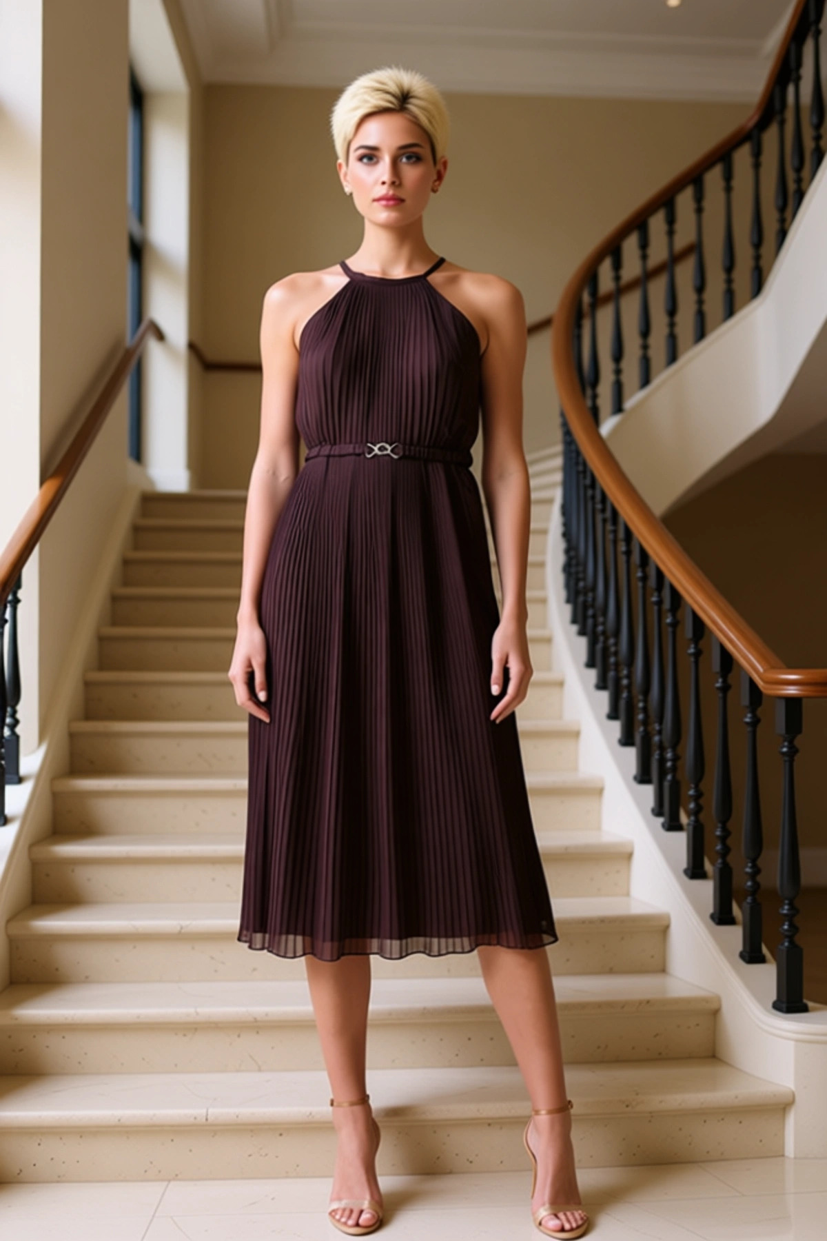 Kadın Halter Yaka Kolsuz Piliseli Midi Elbise Fonksiyonel Dayanıklı Estetik için 24 değerlendirme