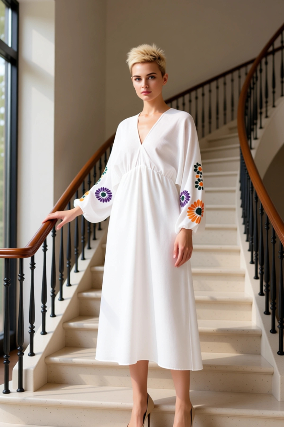 Bu midi boy dokuma elbise, %100 Pamuk/Viskoz materyal bileşeni ile üretilmiştir.; Skater kalıbı sayesinde rahat bir kullanım sunarken, A-line silueti zarif bir görünüm katmaktadır.; Elbisenin uzun kolları ve V yaka detayı, modern bir estetik sunar.; Üzerindeki çiçek nakışları ve işlemeleri, tasarıma özgün bir dokunuş ekler.; Tam düğme kapama özelliği pratik bir kullanım sağlarken, astarlı yapısı ekstra konfor sunar.; Günlük kullanım için ideal olan bu elbise, cool ve rahat bir persona yansıtır.; Dokuma kumaşın hafifliği ve nefes alabilirliği, özellikle sıcak havalarda tercih edilmesini sağlar.; Nakışlı desenler, elbiseye sanatsal bir hava katarken, rengi her zevke hitap eder.; Elbisenin V yaka tasarımı, boyun bölgesini zarifçe vurgular.; Uzun kolları, hem şık bir görünüm sunar hem de serin havalarda koruma sağlar.; Skater kalıp, belden aşağı doğru genişleyerek rahat hareket imkanı sunar ve vücut hatlarını güzelce örter.; A-line silueti, her vücut tipine uyum sağlayarak dengeli bir oran oluşturur.; Tam düğme kapama detayı, elbisenin önünü tamamen açıp kapatmaya olanak tanır, bu da giyip çıkarmayı kolaylaştırır.; Astarlı olması, kumaşın tenle temasında ekstra bir yumuşaklık ve pürüzsüzlük hissi verir.; Nakış detayları, elbiseye sofistike bir estetik katarken, genel olarak rahat ve şık bir görünüm sağlar.; Bu elbise, hem günlük hayatta hem de özel günlerde rahatlıkla tercih edilebilir.; Bu elbise, ilkbahar ve yaz mevsimleri için mükemmel bir seçenektir.; Kombin önerisi olarak, kot pantolonlar, keten şortlar veya basic eteklerle rahat bir günlük şıklık yakalayabilirsiniz.; Ayakkabı olarak ise espadriller, sandaletler veya spor ayakkabılarla tamamlayabilirsiniz.; Elbisenin bakımı için, kumaşın yapısını korumak adına nazik yıkama yöntemleri tercih edilmelidir.; Bu sayede elbisenizin ömrünü uzatabilir ve ilk günkü görünümünü koruyabilirsiniz.