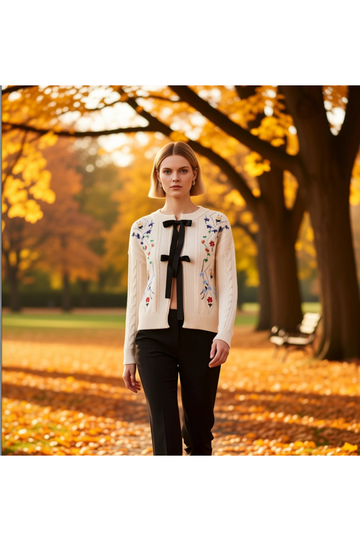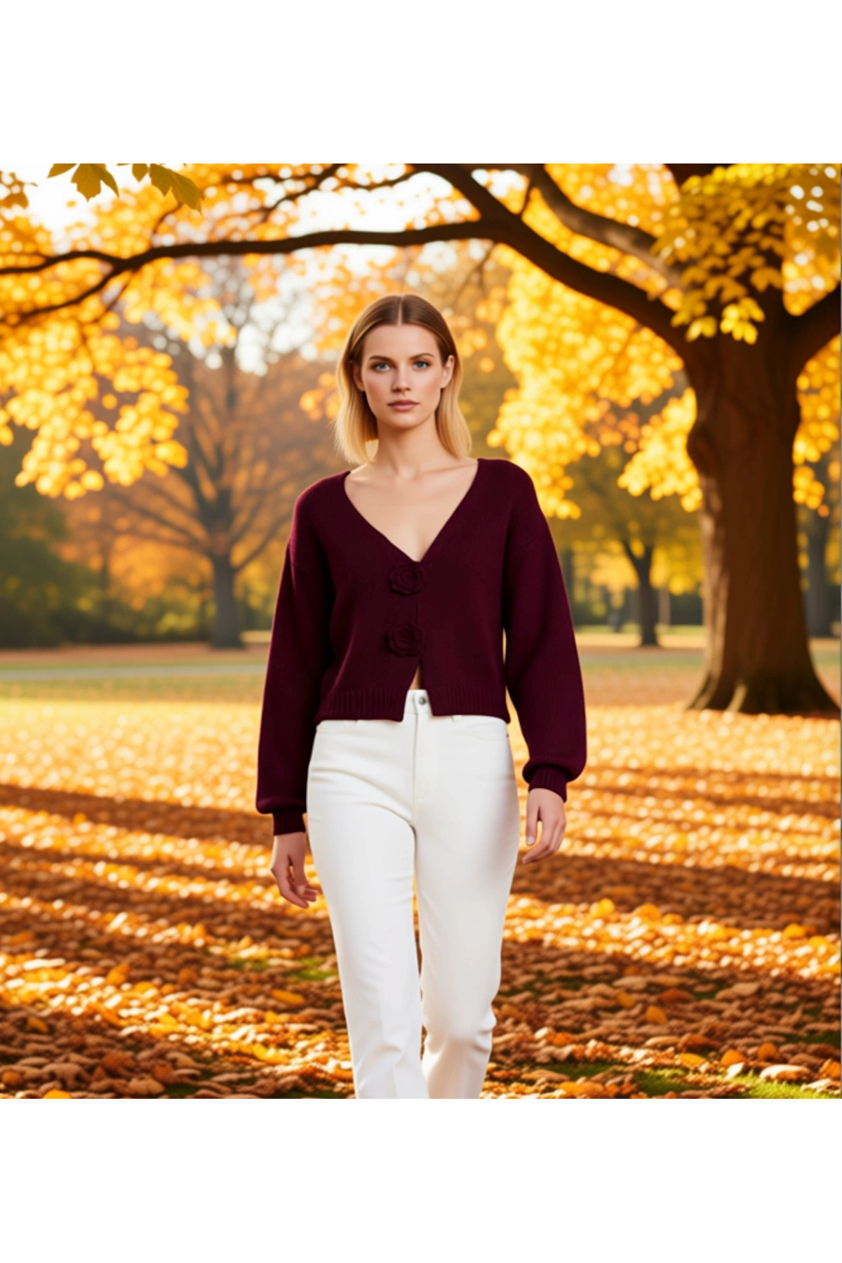 Kadın Regular Kesim V Yaka Balon Kol Gül Detaylı Crop Triko Hırka Yumuşak Dokusuyla Şıklık Sunar
