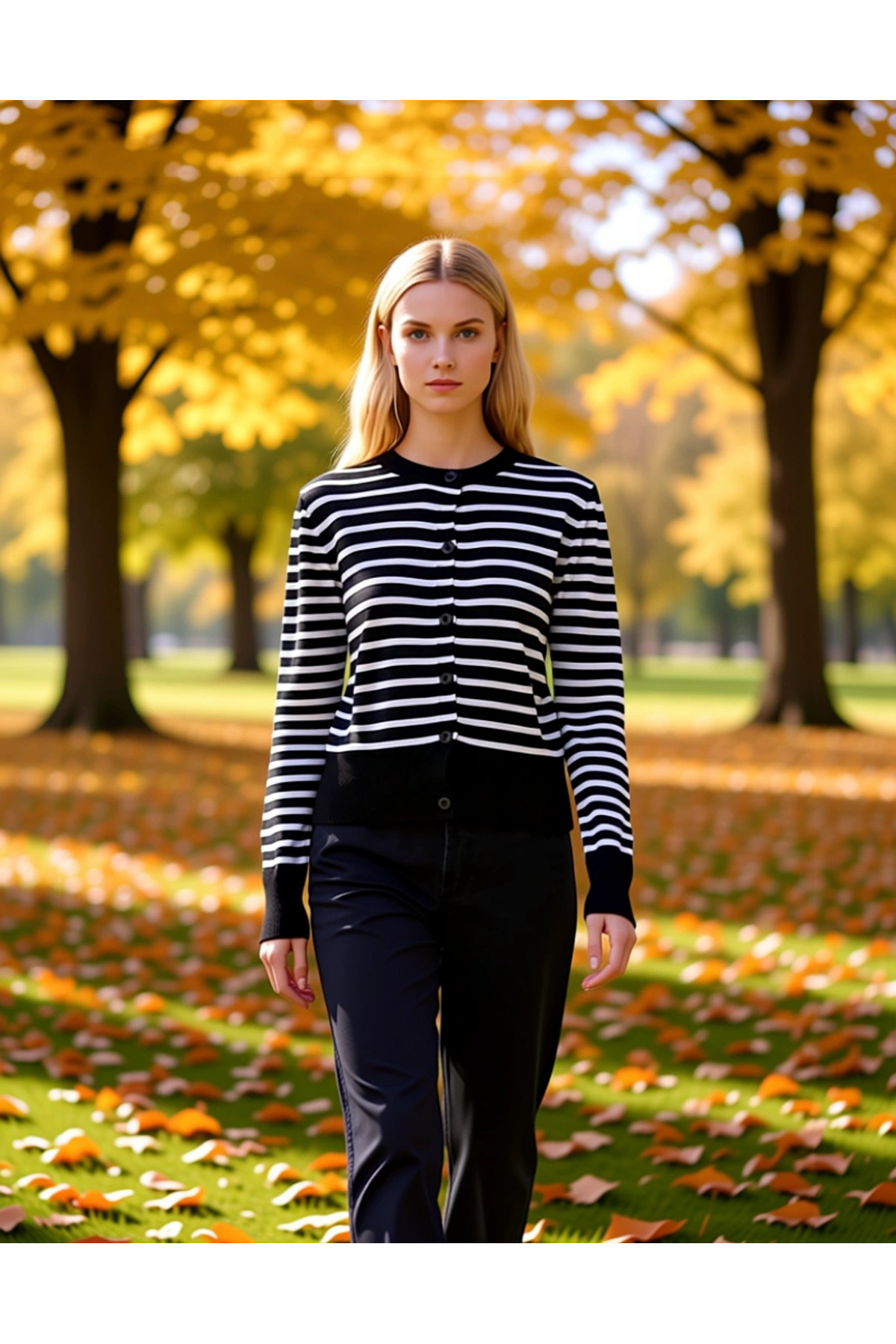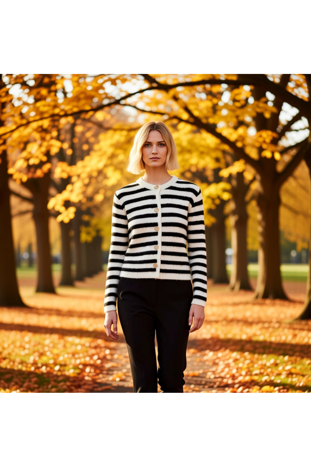 Kadın Yumuşak Dokulu Çizgili Bisiklet Yaka Uzun Kollu Düğmeli Regular Fit Triko Hırka Konforlu ve
