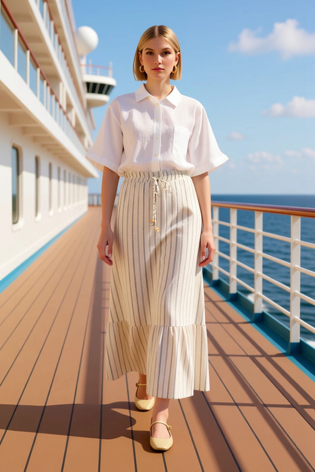 Kadın Alt Üst Bağcık Detaylı Belden Büzgülü Uzun Kollu Dokuma Gömlek Ve Geniş Paça Pantolon Takımı