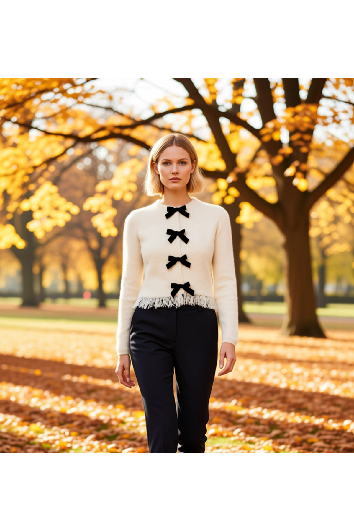 Kadın Dokulu Buklet İplik Düşük Kol Bisiklet Yaka Kurdele Detaylı Püsküllü Kısa Triko Hırka