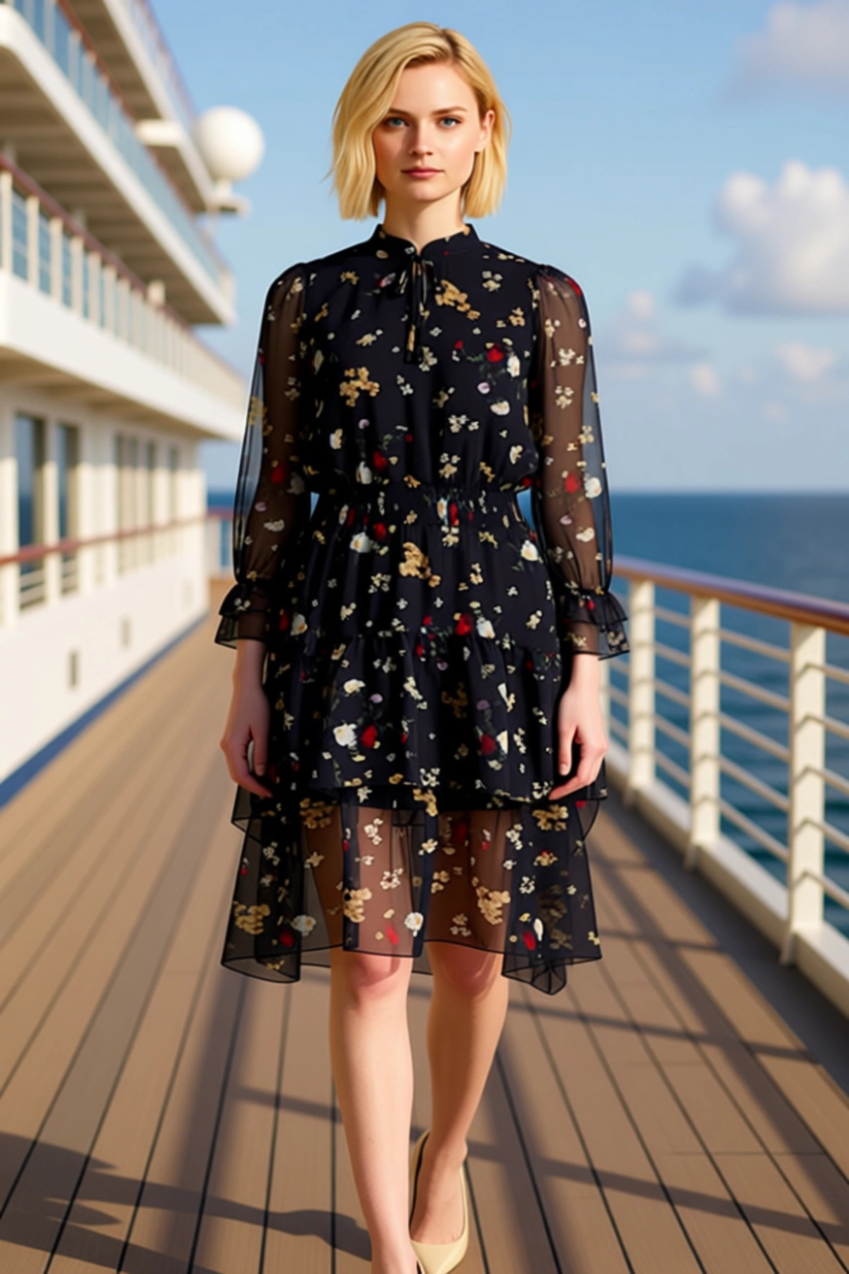 Kadın Büyük Beden Boyundan Bağlamalı Standart Kol Şal Desen Şifon Midi Elbise Fonksiyonel Şık